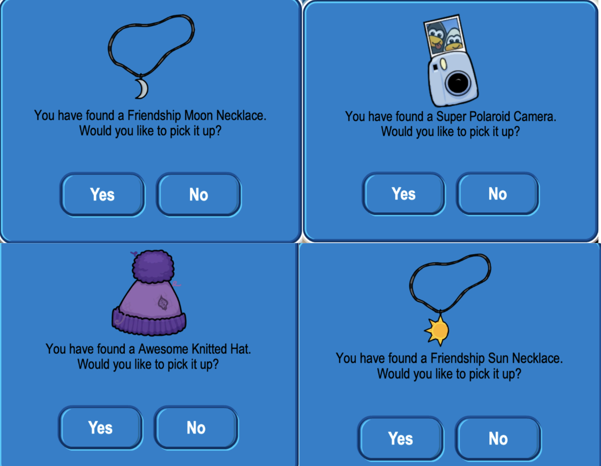 The following items can be found in the Ski Hill, Book Room, Town and Snow Forts respectively.
