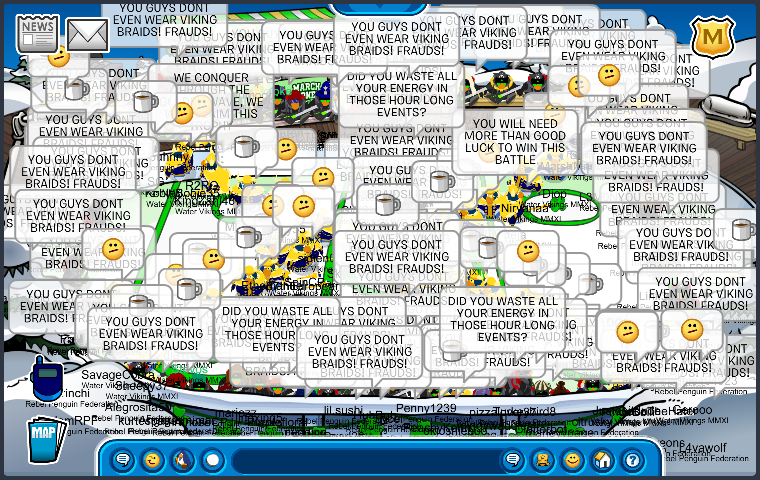 Rebel Penguin Federation faced off against the Shadow Legionaries sizes were 65-12 in RPF‘s favor and by the end of the event Rebel Penguin maxed 76. RPF completely covered them in bombs, forms and tactics making it a solid win for the first room, Inside Mines. However by Room 2, Snow Forts, SL slowly died off leaving one member and then they all surrendered making it an automatic win forRebel Penguin.