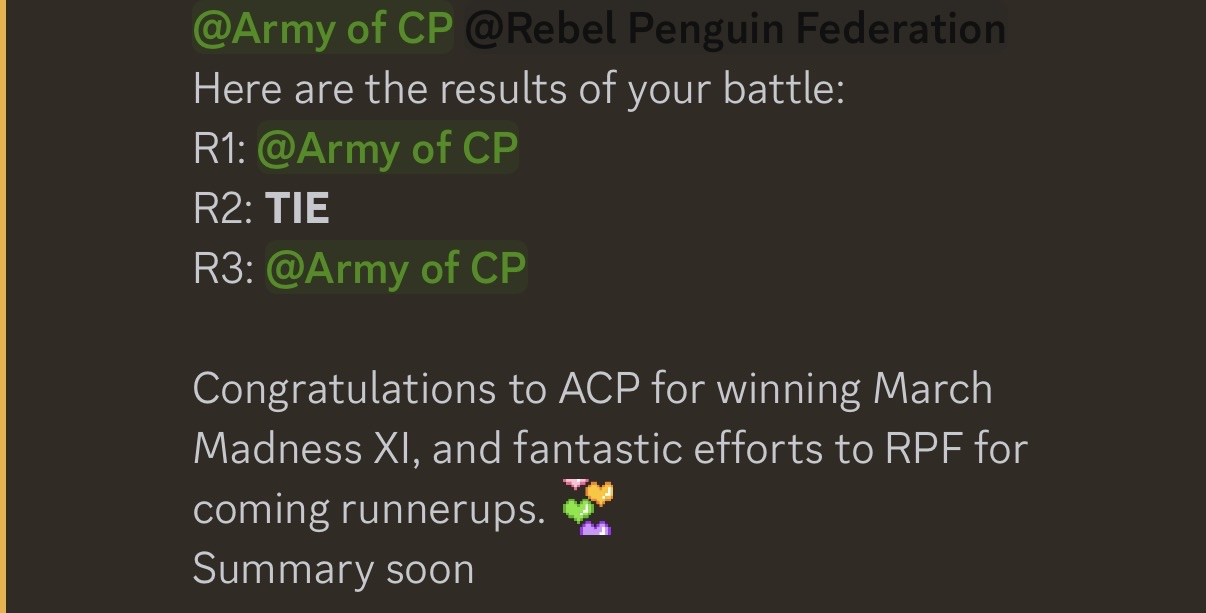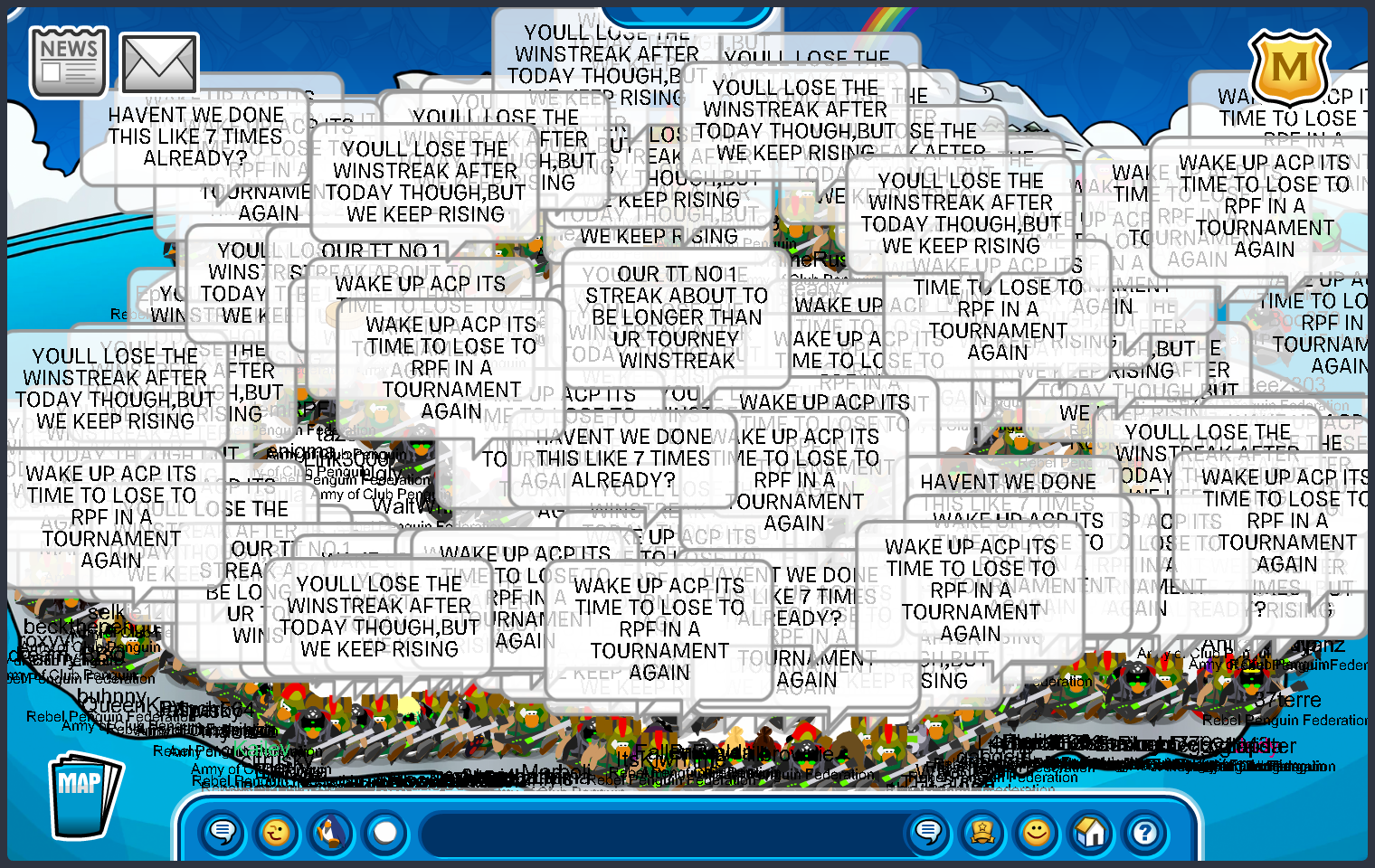 In the final battle of March Madness XI, the Rebels faced our allies, the Army of Club Penguin. With RPF maxing 108 andACP maxing 129, it was sure to be a high stakes fight! We fought on the Iceberg, Inside Mines, and Casa Fiesta with lockouts in every room. In the end, ACPemerged victorious due to winning the first and third rooms, but both armies put up an incredible fight! With this, theRebels were deemed as the official runner-ups for MMXI.