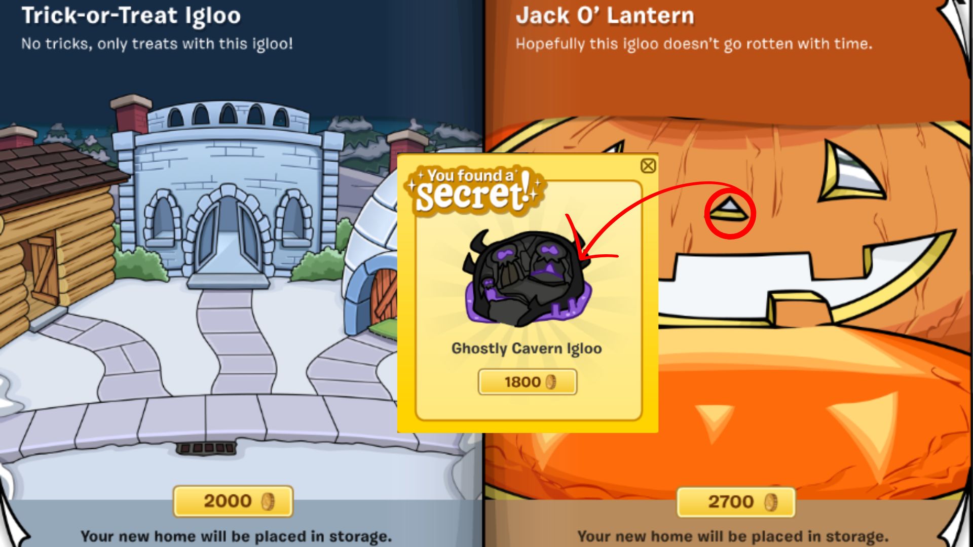 ★ Click on the nose of Jack-O’Lantern igloo for the Ghostly Cavern Igloo (1800 coins)
