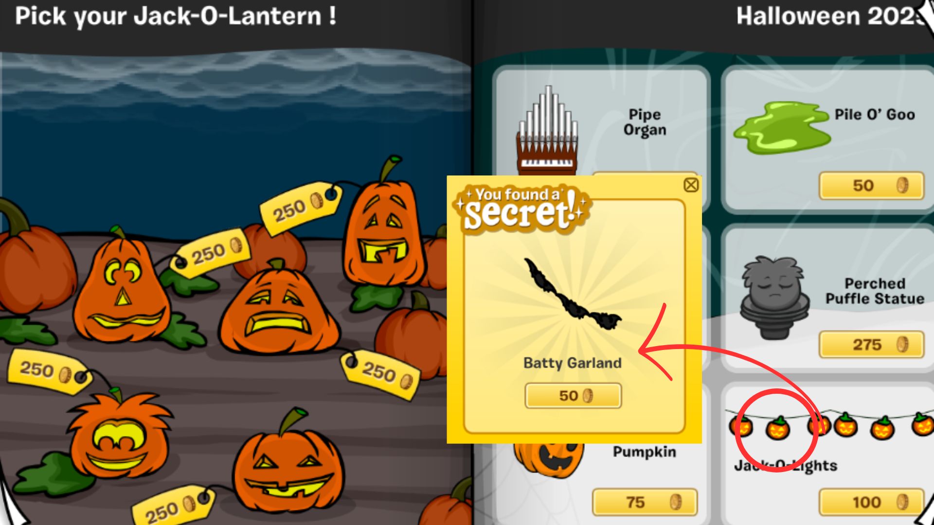 ★ Click the second Jack-O’Light for the Batty Garland (50 coins)