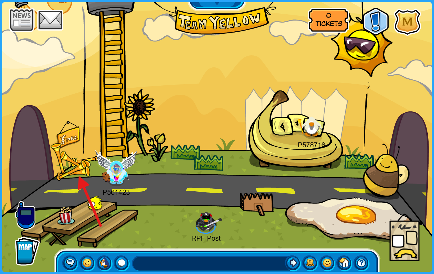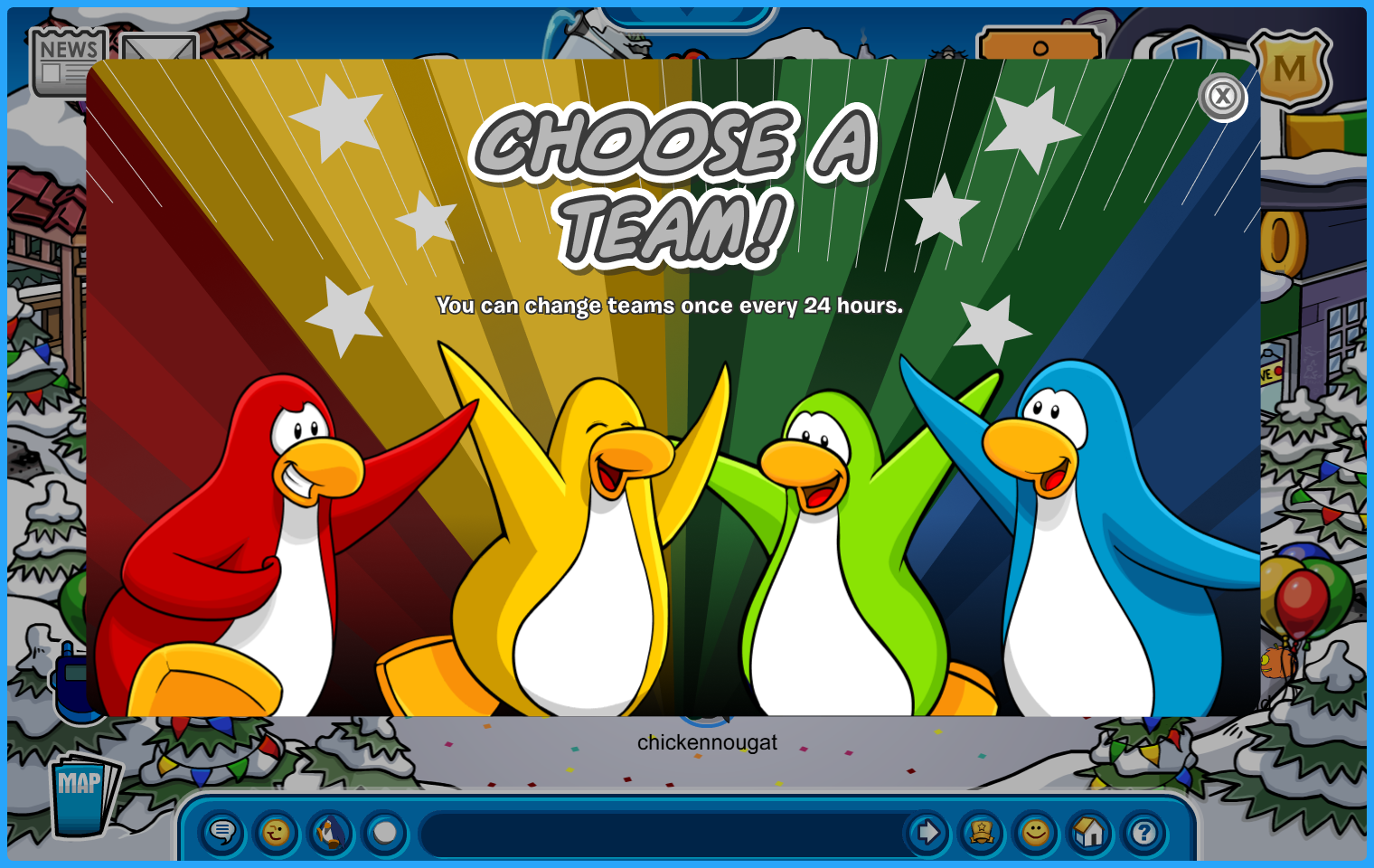 Throughout the party, you can choose to be on either the Red, Yellow, Green, or Blue Team! Show your support by clicking the ticket icon and select which one you’d like to join. You can change teams once per day!