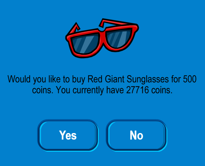 Click the red lightbulb on the right side of the page for “Red Giant Sunglasses” – 500 coins
