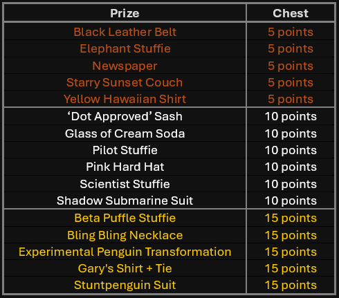 Rory sells 5, 10, and 15-point chests.