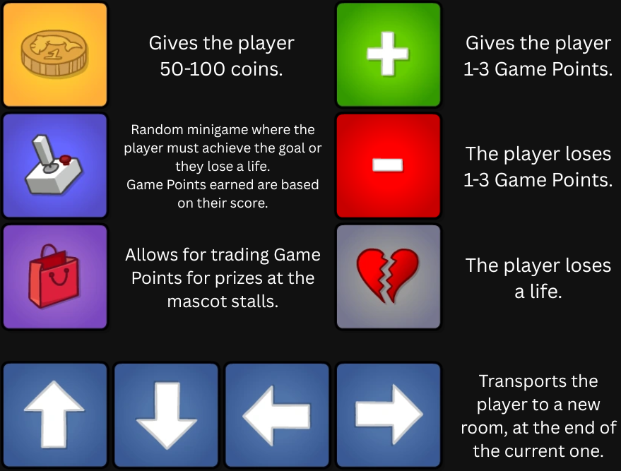 The player has to collect Game Points through an infinite number of rooms, by luck and by completing minigame challenges! The spinning wheel at the bottom right of the screen determines how many points we get or how many spaces the player moves.