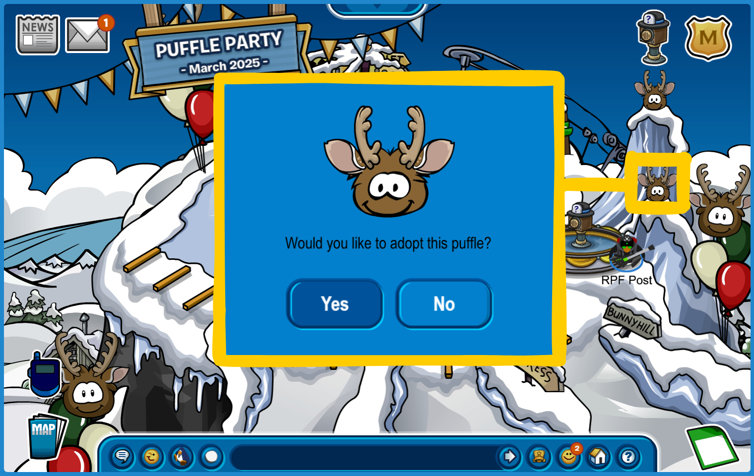 Adopt a Reindeer Puffle at the Ski Hill to the left of the Ski Village.