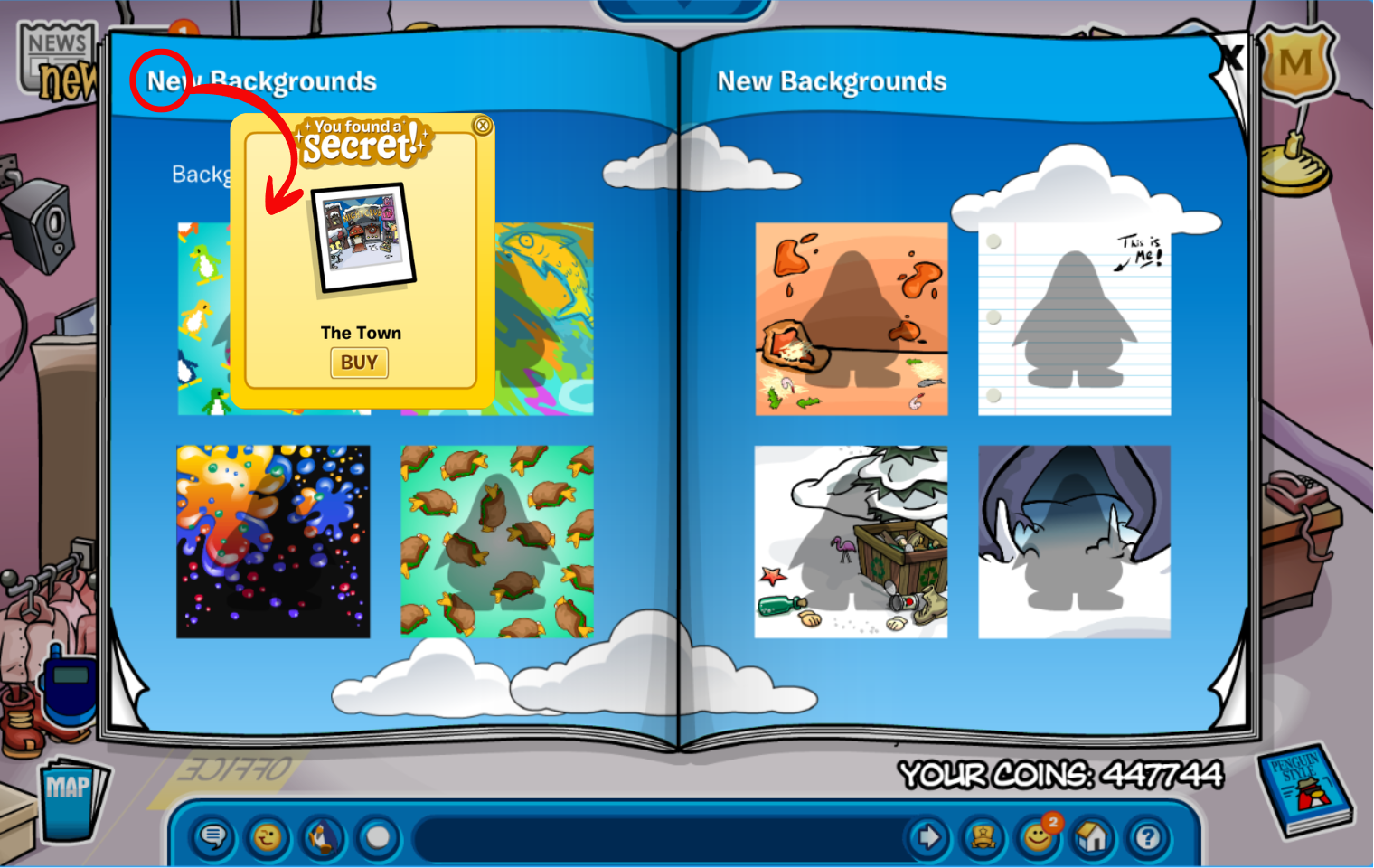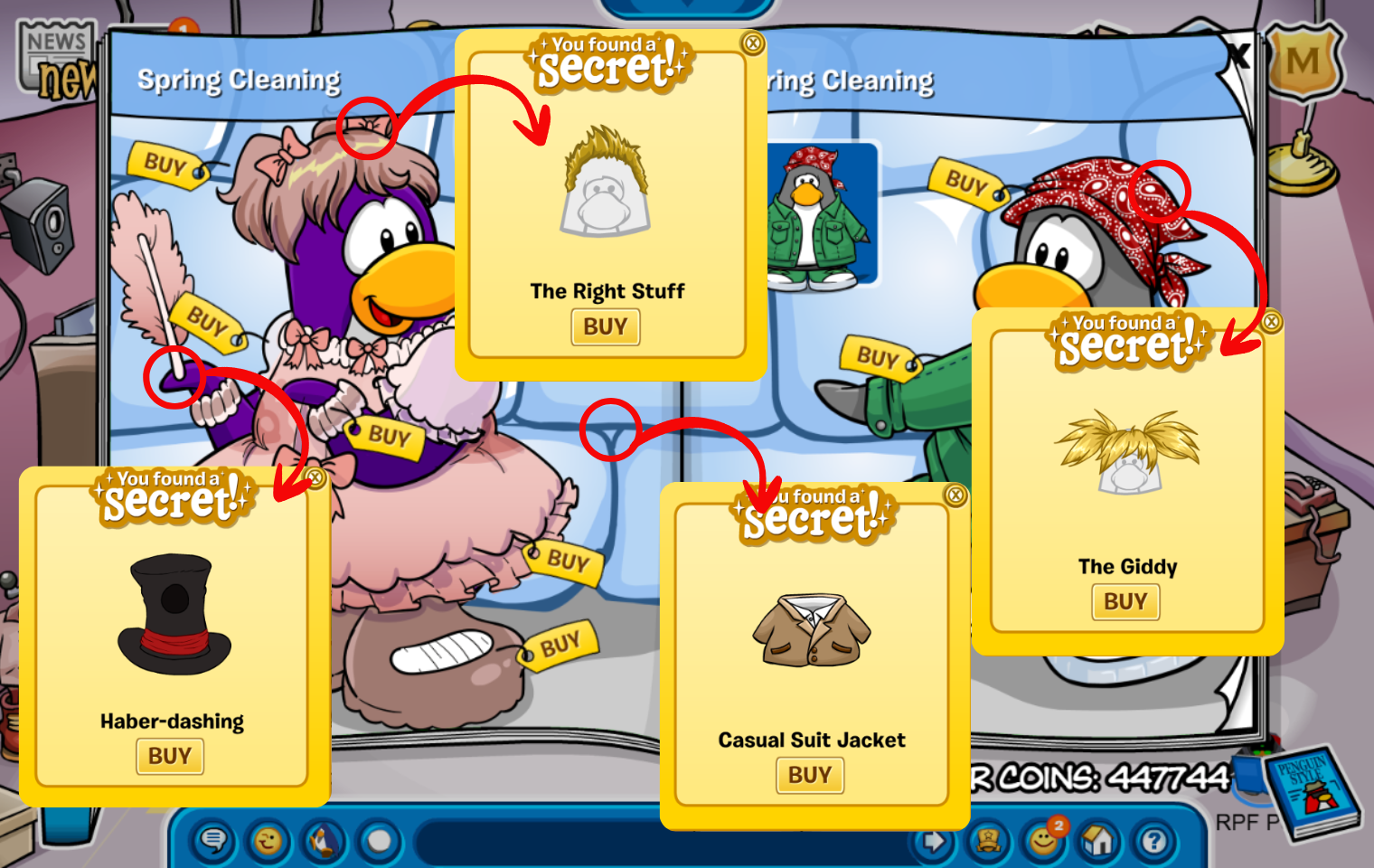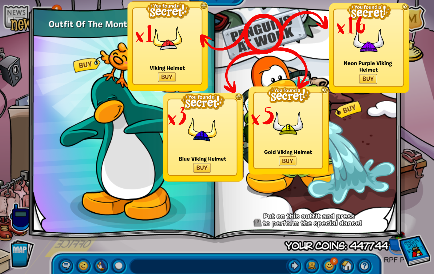 Neon purple viking helmet – Click the ‘Penguins at Work’ sign sixteen times – 2000 coins