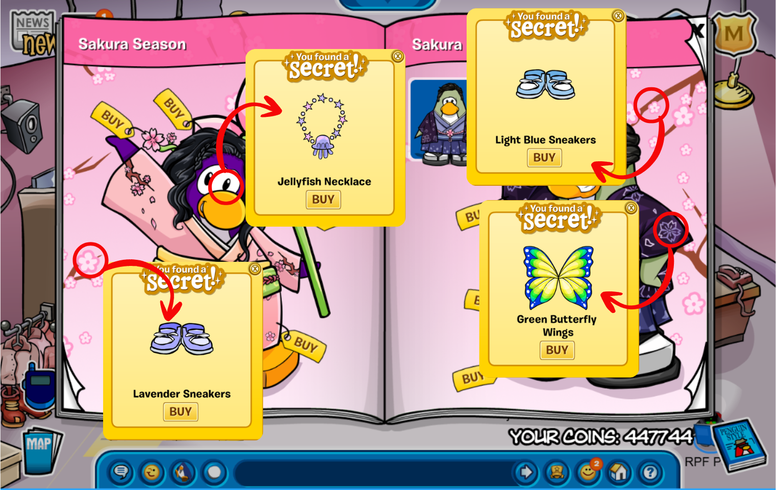 Green butterfly wings – Click the flower on the right penguin’s haori – 200 coins
