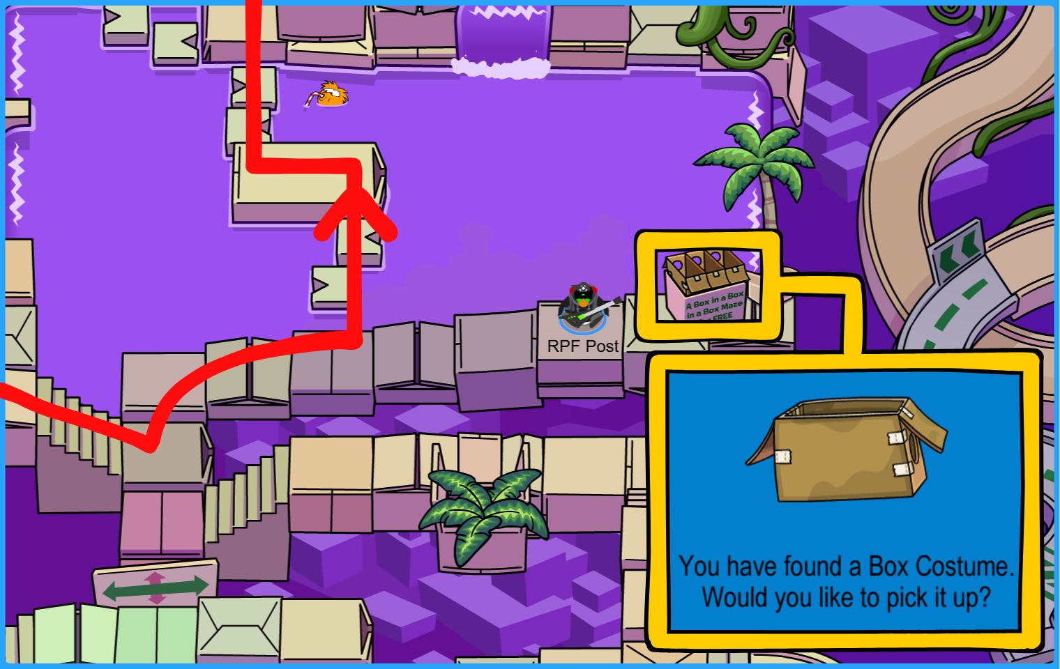 Head northeast to get your Box Costume then head north of the waters!