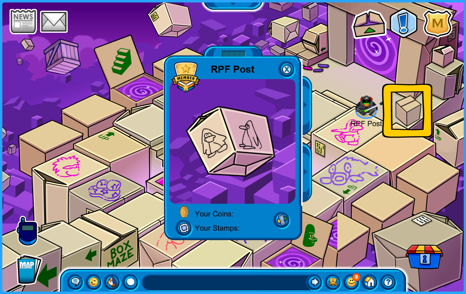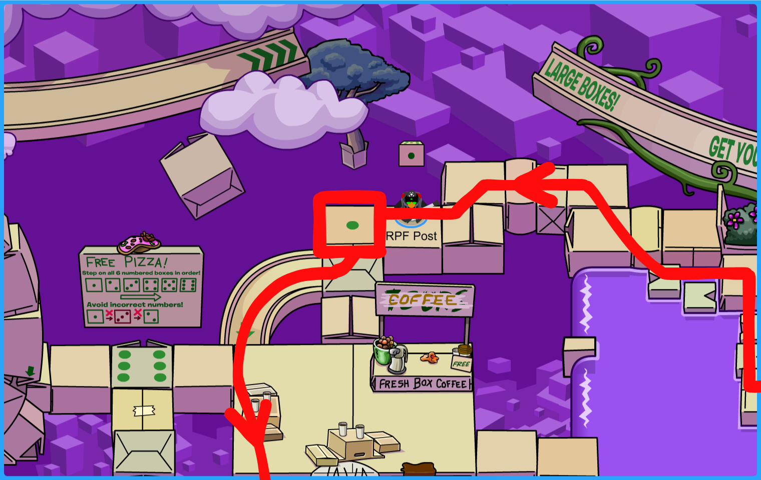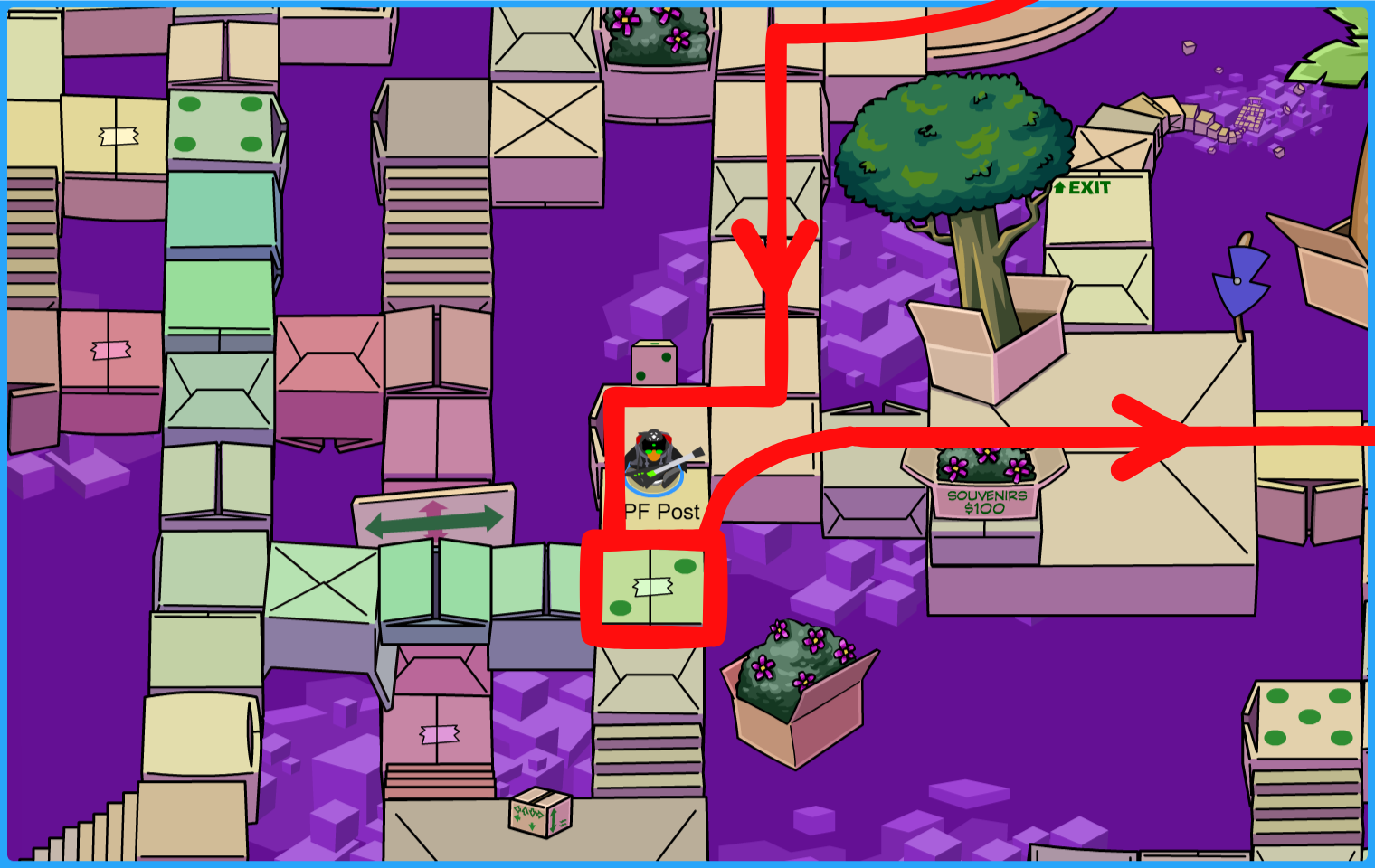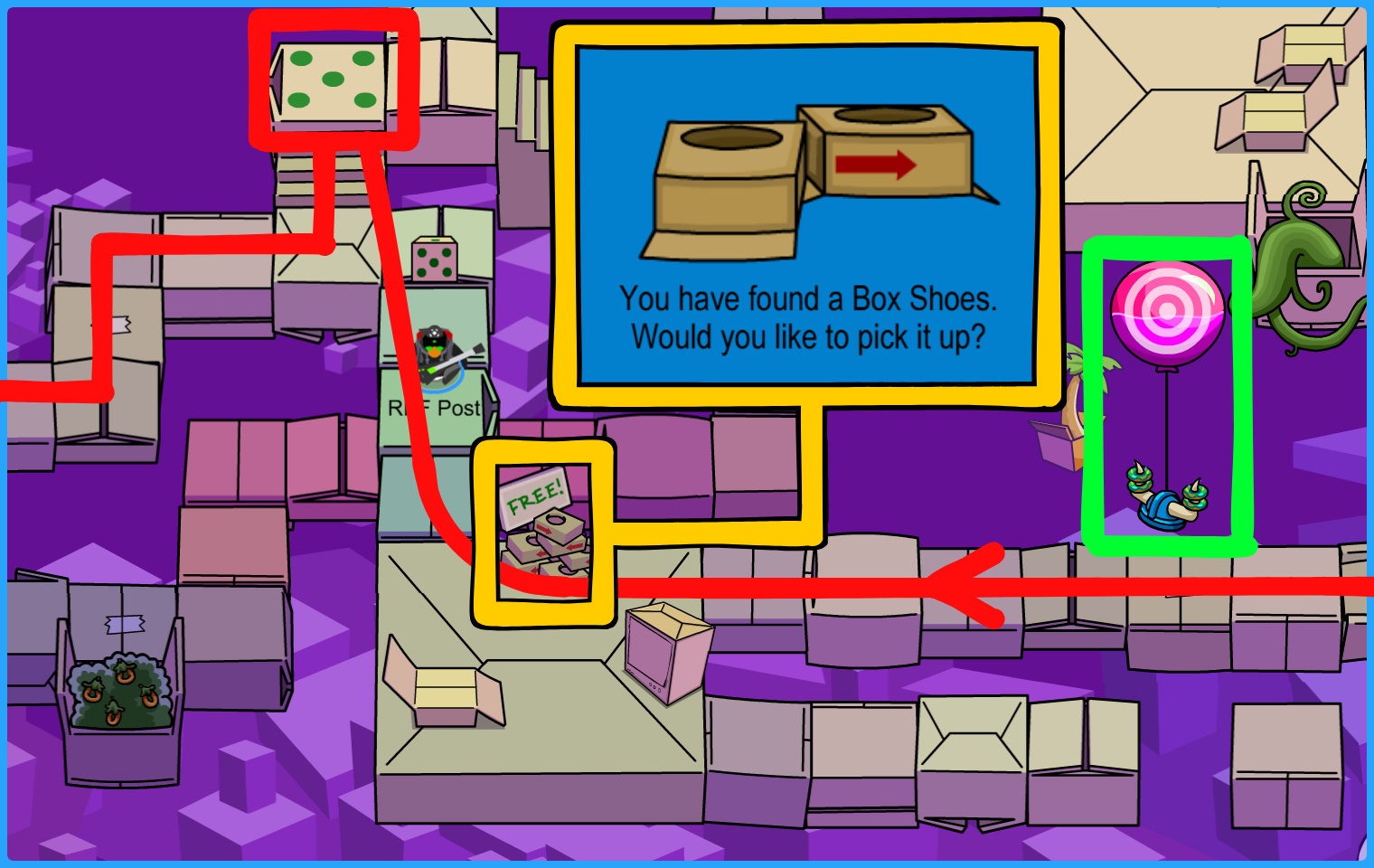 Get your Box Hat, hit the floating target below with a snowball, and go to the colored dimension boxes. The target will then reappear five more times in different areas!