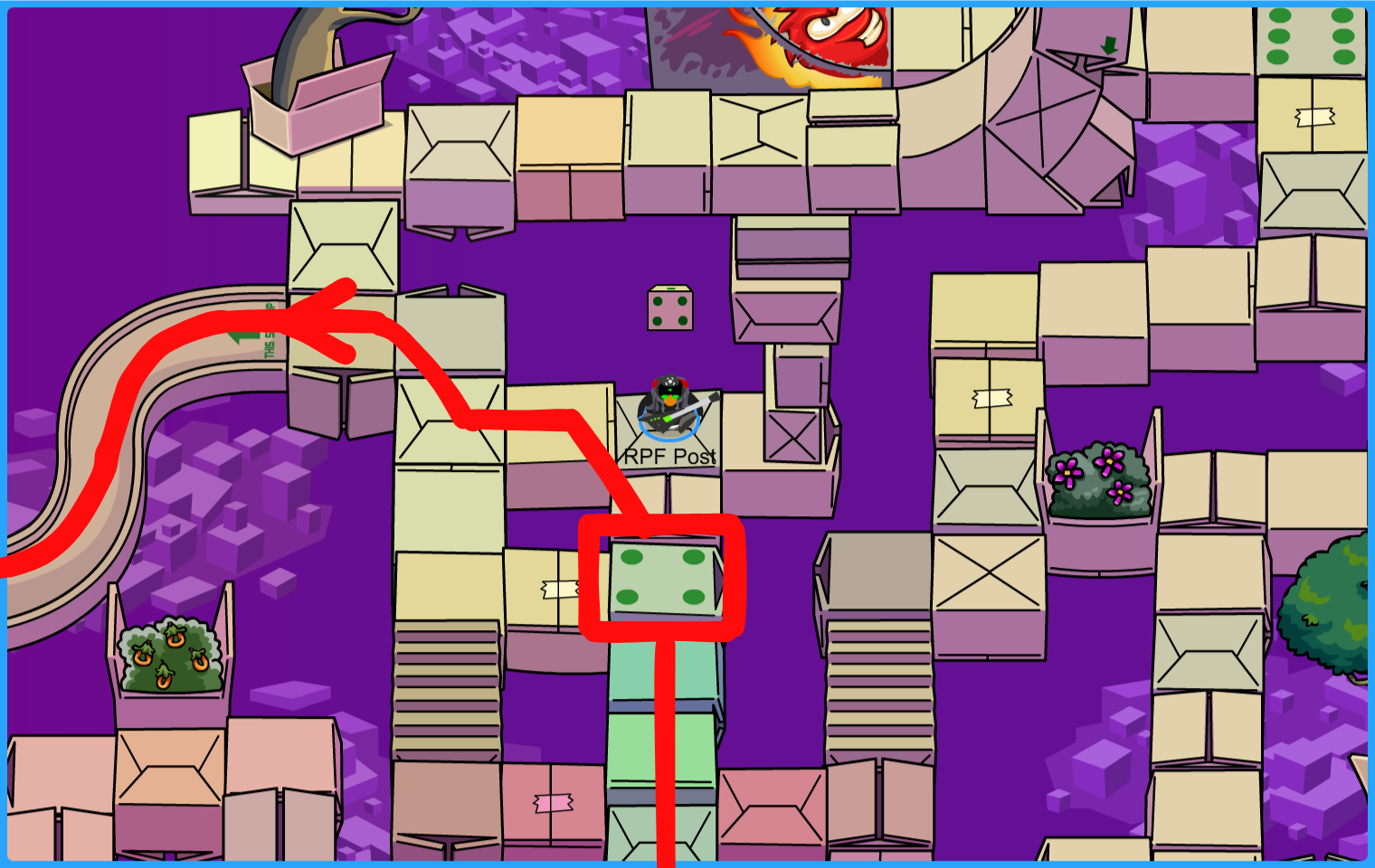 Head south to the second dice then move east past our starting point!