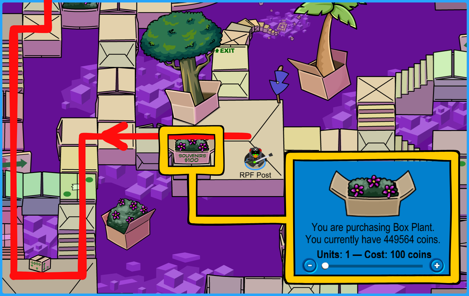 Get your Box Plant for 100 coins each then follow the path west!