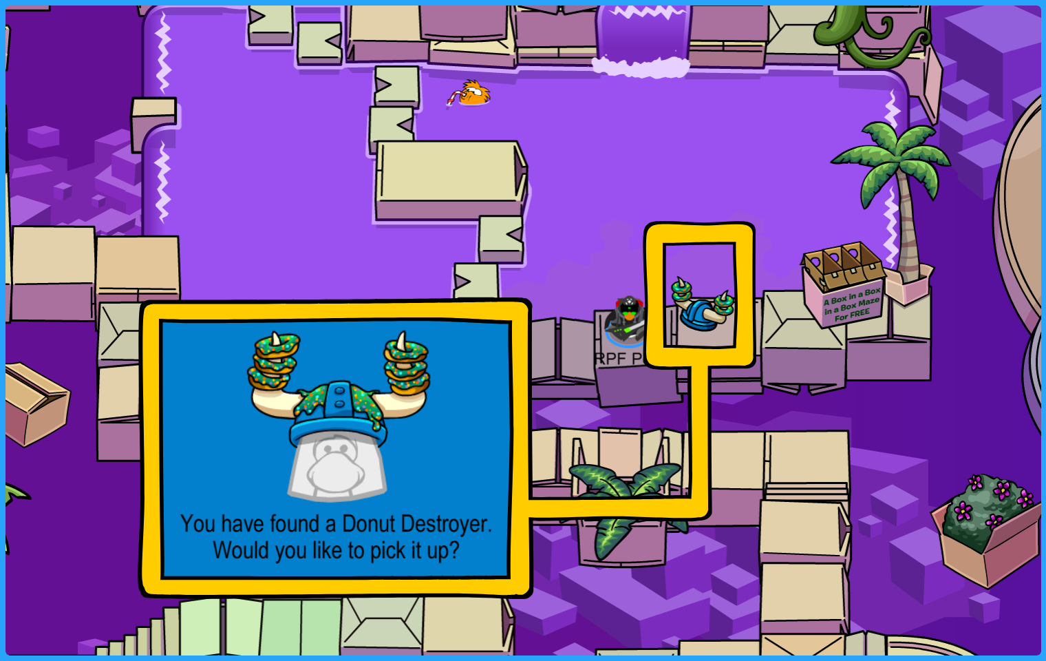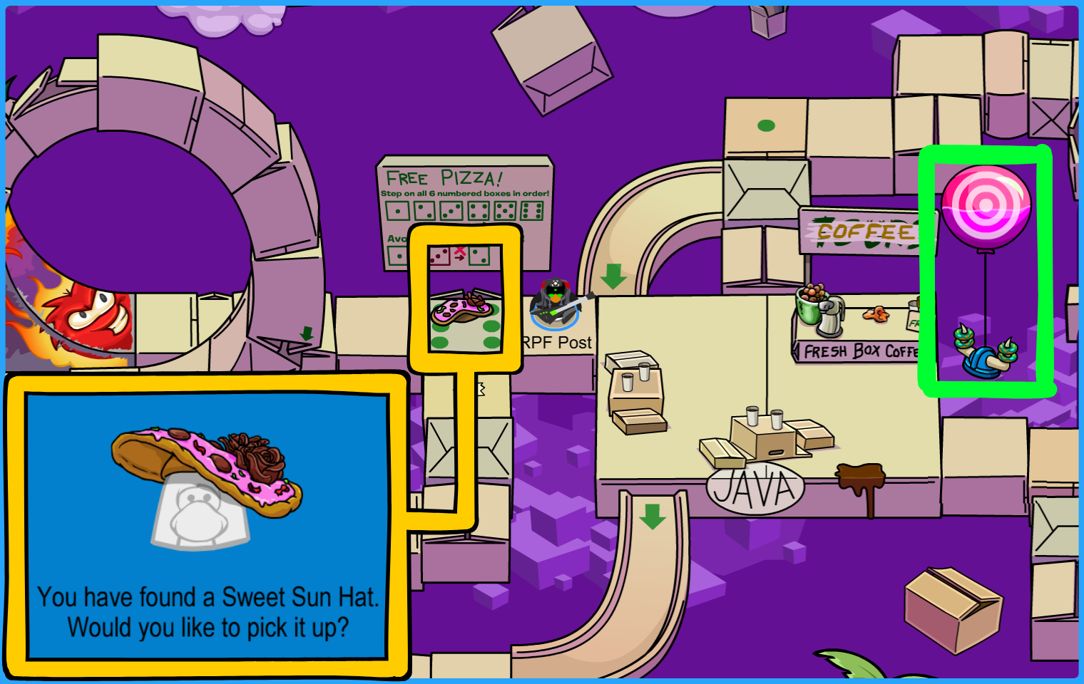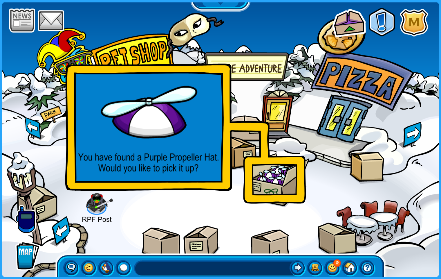 Location: Plaza. A box of Purple Propeller Hats is in display!