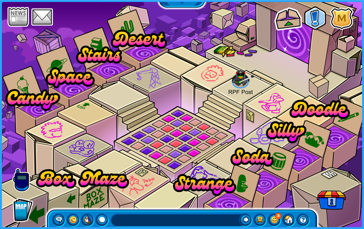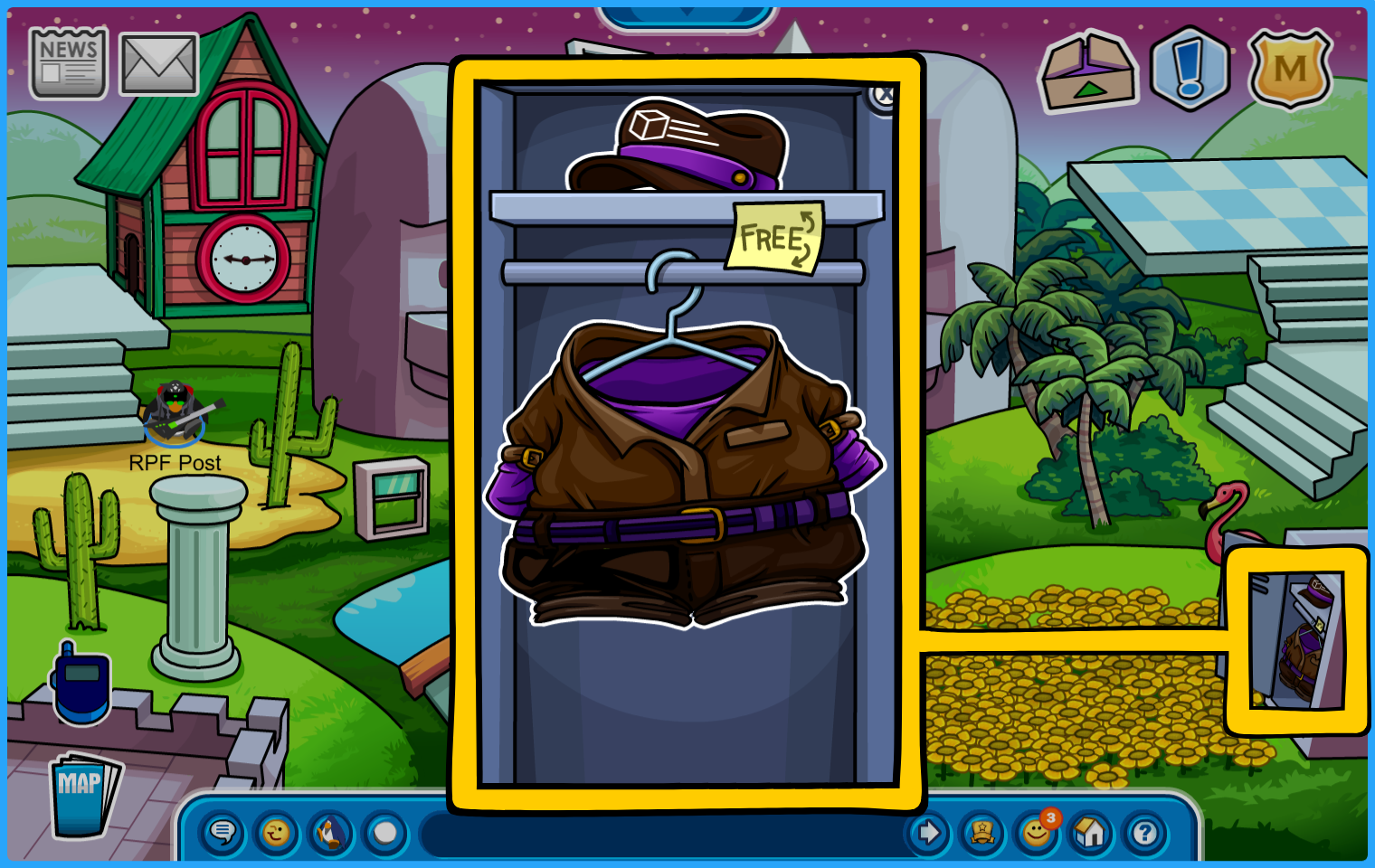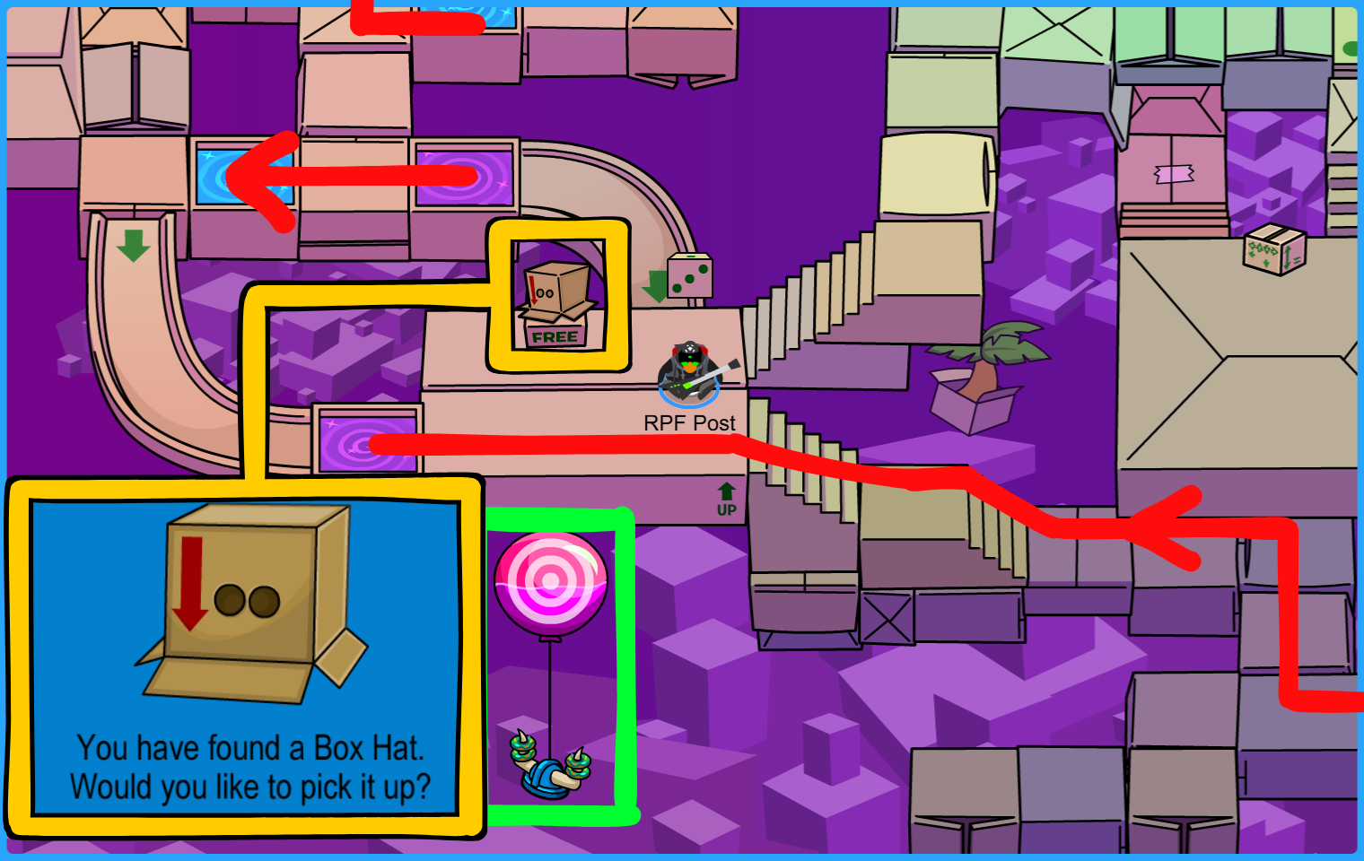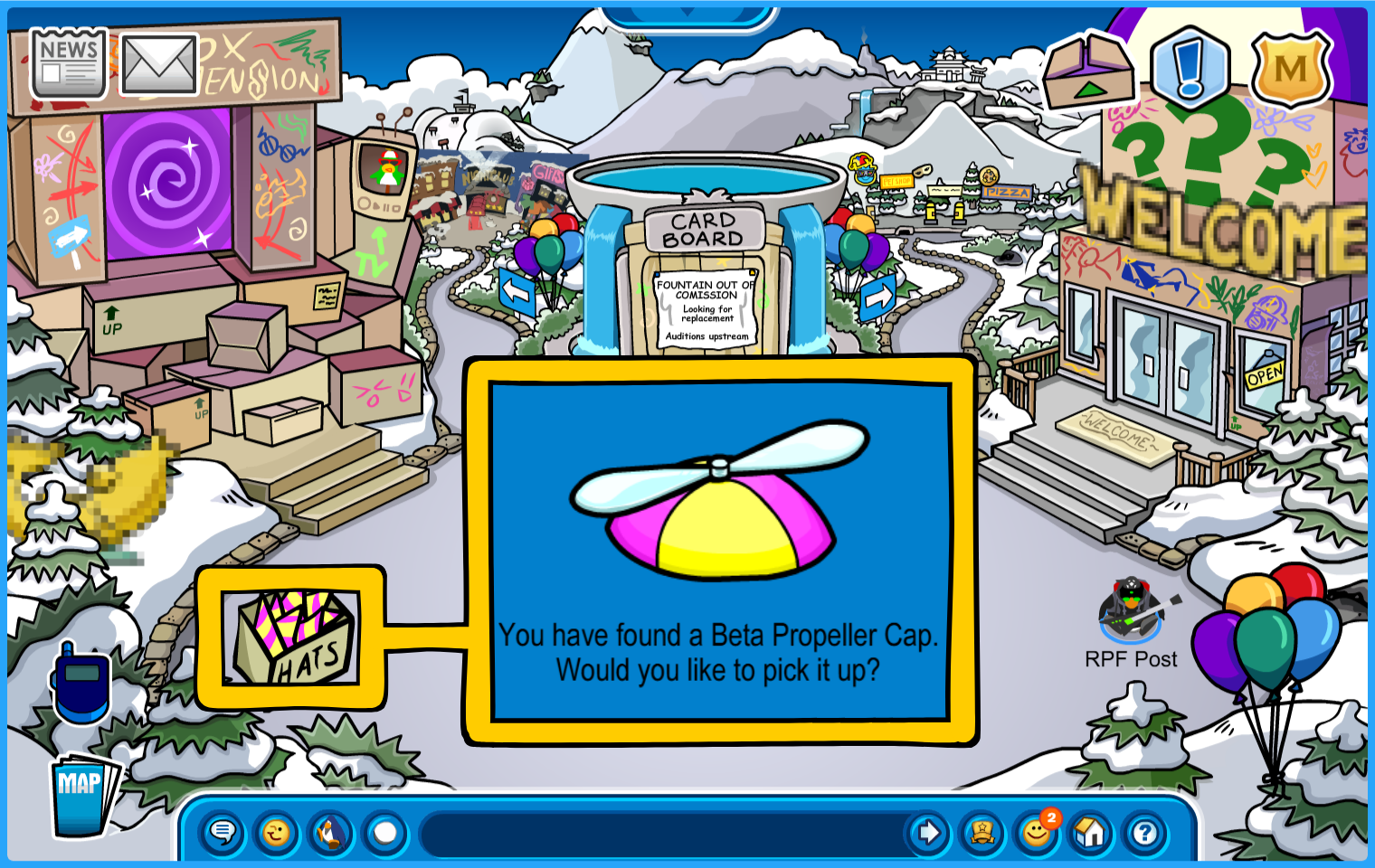 Location: Plaza. A box of Purple Propeller Hats is in display!