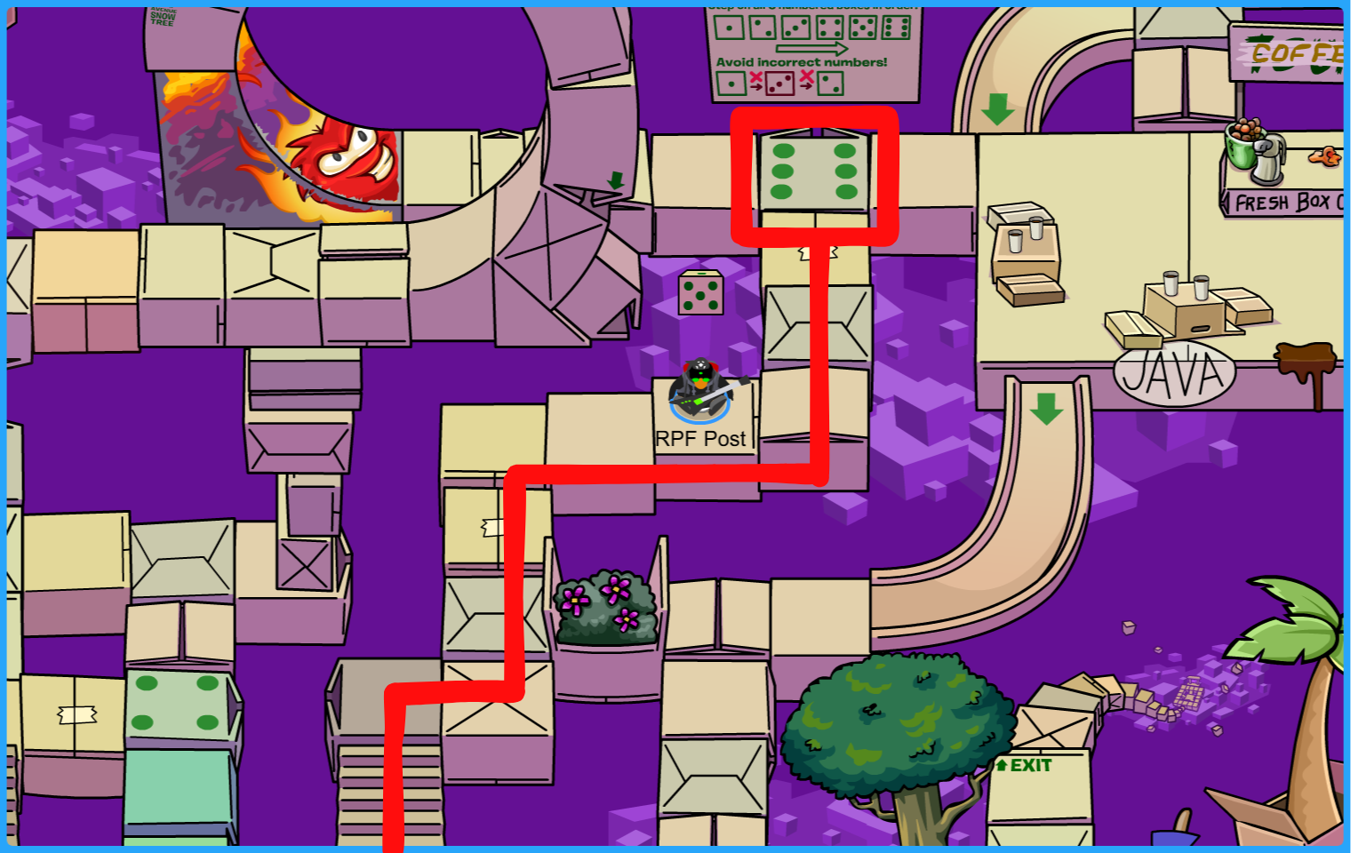 Move down, left, choose the left path to north until you get to the sixth dice!