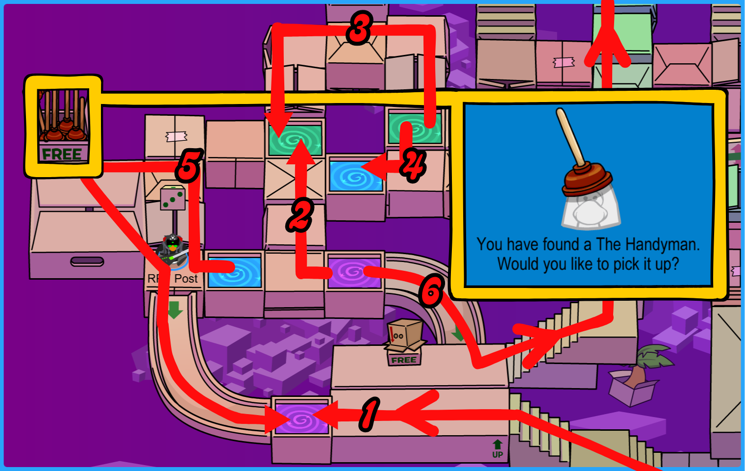 Get The Handyman by going through the dimension boxes – purple, green, green, blue, item. Slide, purple. Go up the stairs after, then head north!