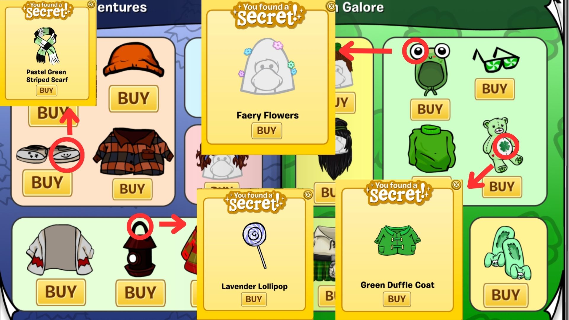 Green Duffle Coat: Click on the Four Leaf Clover on the teddy bear belly– 600 coins