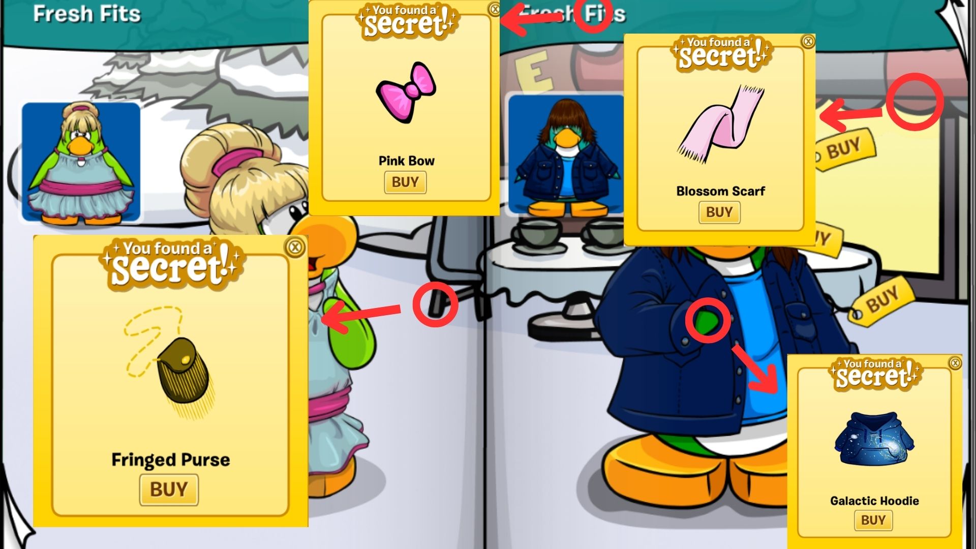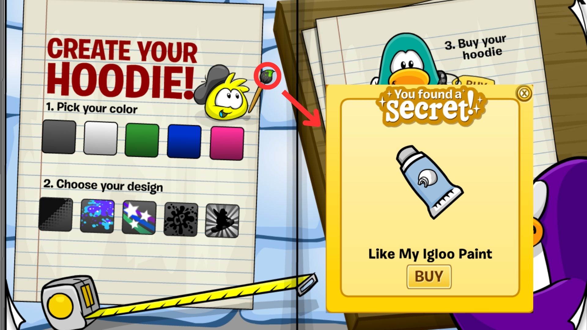 Galactic Hoodie: Click on the Dark Green Penguin left hand – 300 coins