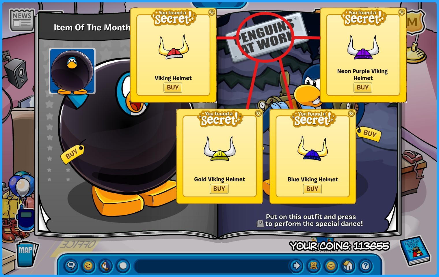 Neon Purple Viking Helmet: Click “Penguins at Work” 16 times – 2000 coins