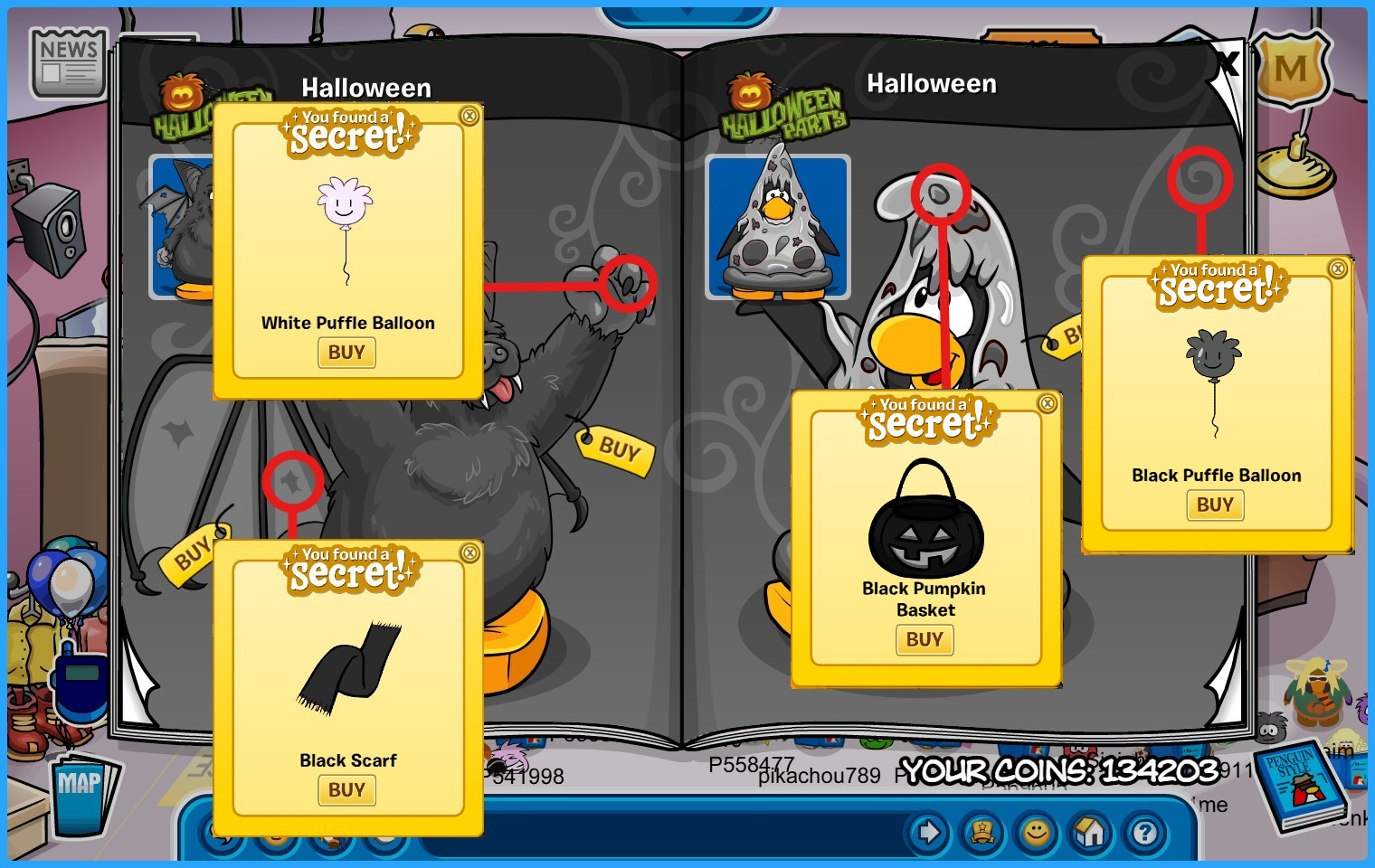 Black Puffle Balloon: Click the swirl in the background – 50 coins