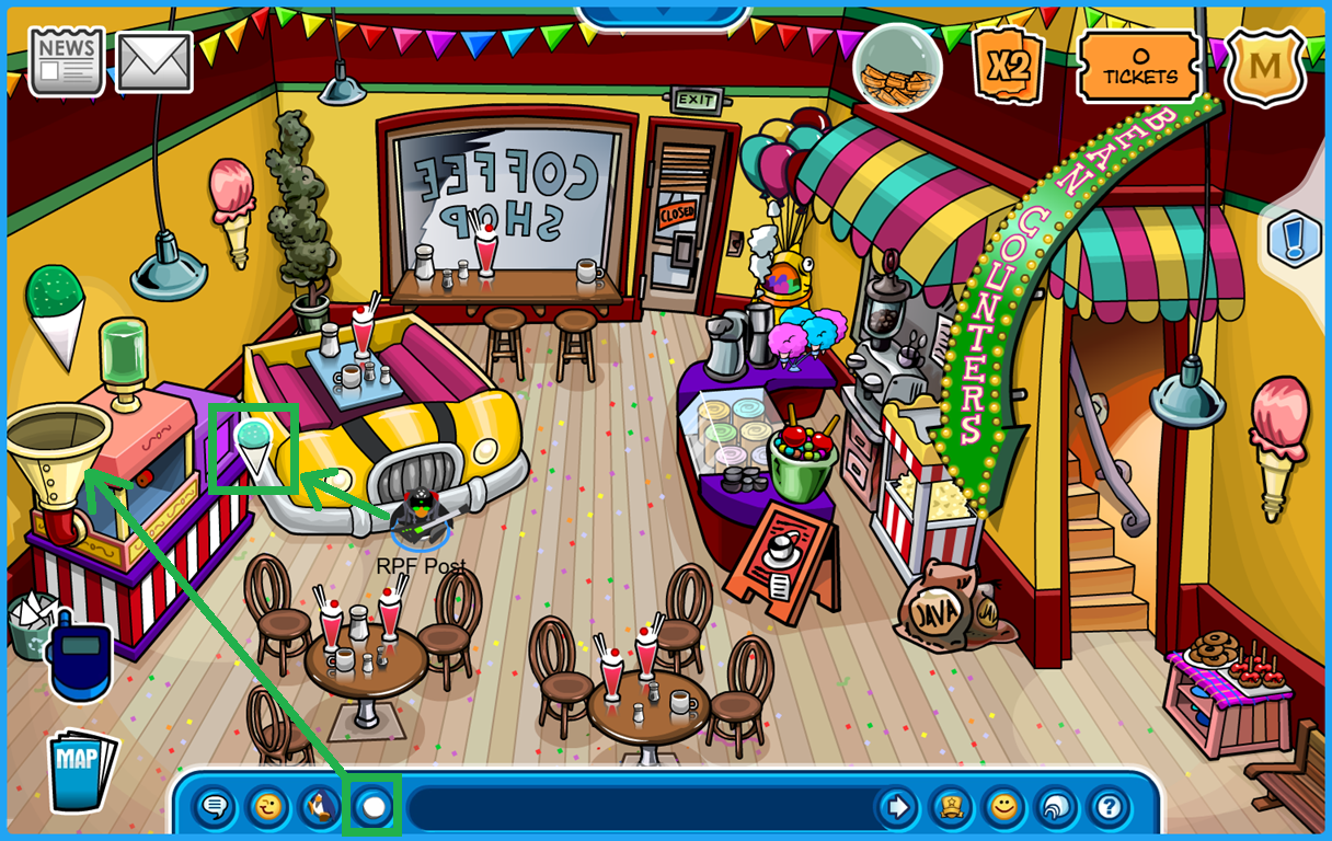 Head on over to the Coffee Shop and throw snowballs into the snow cone machine to a hidden pin!