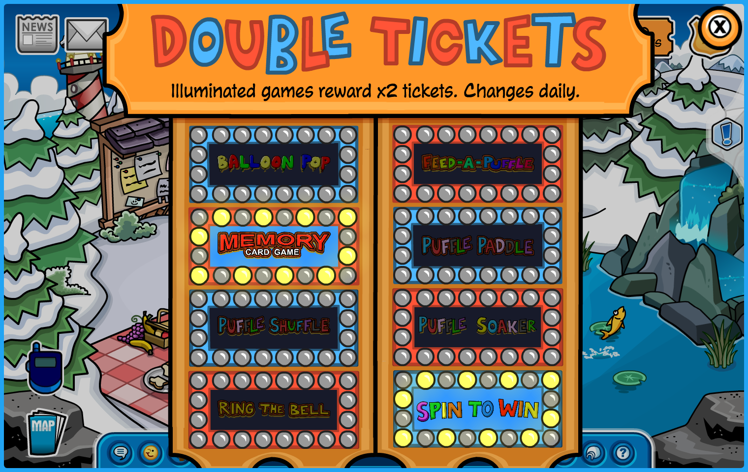 When a game has flashing lights surrounding it, that means that playing it will earn you double the tickets. The two games with this feature will change every everyday, so be sure keep your eye on the Interface!