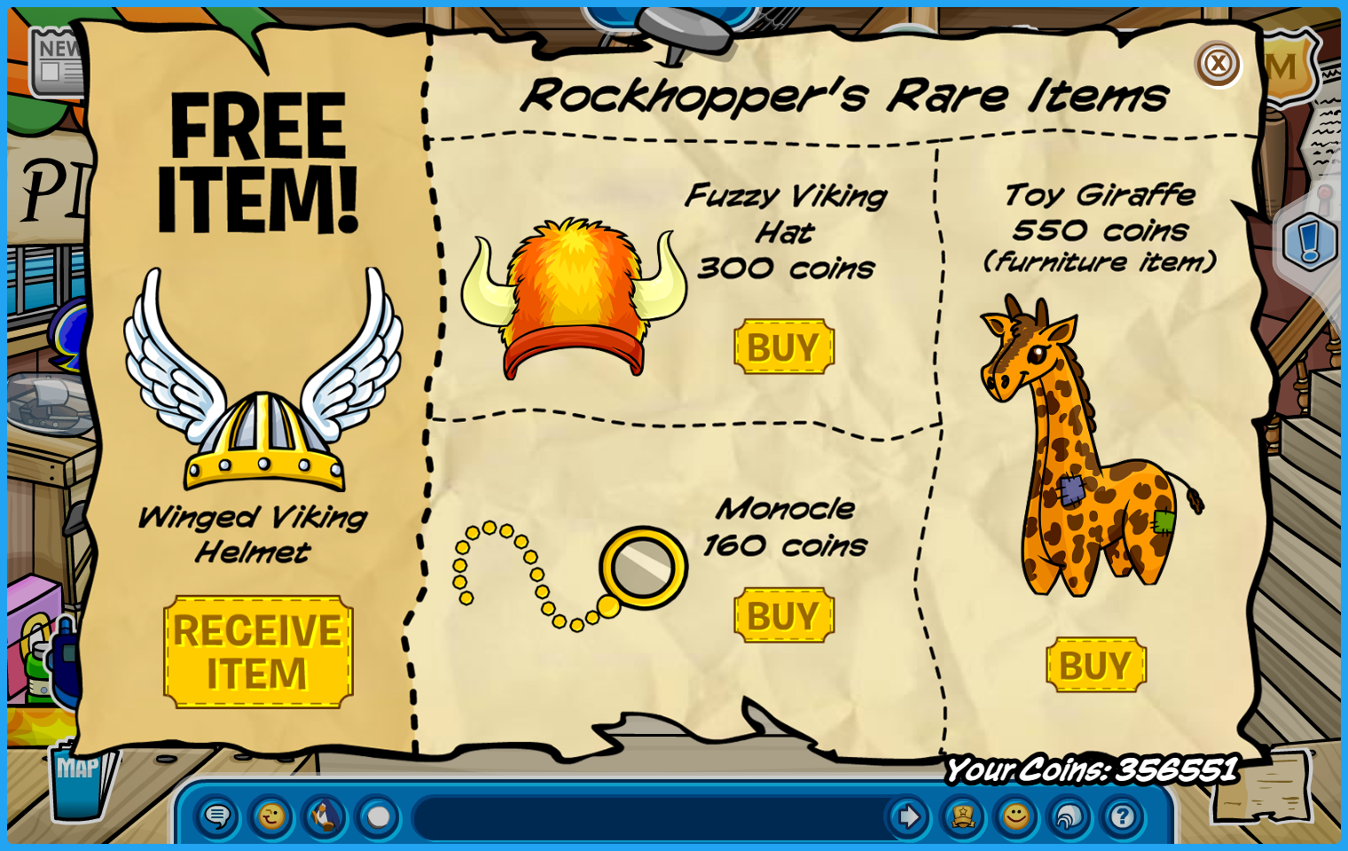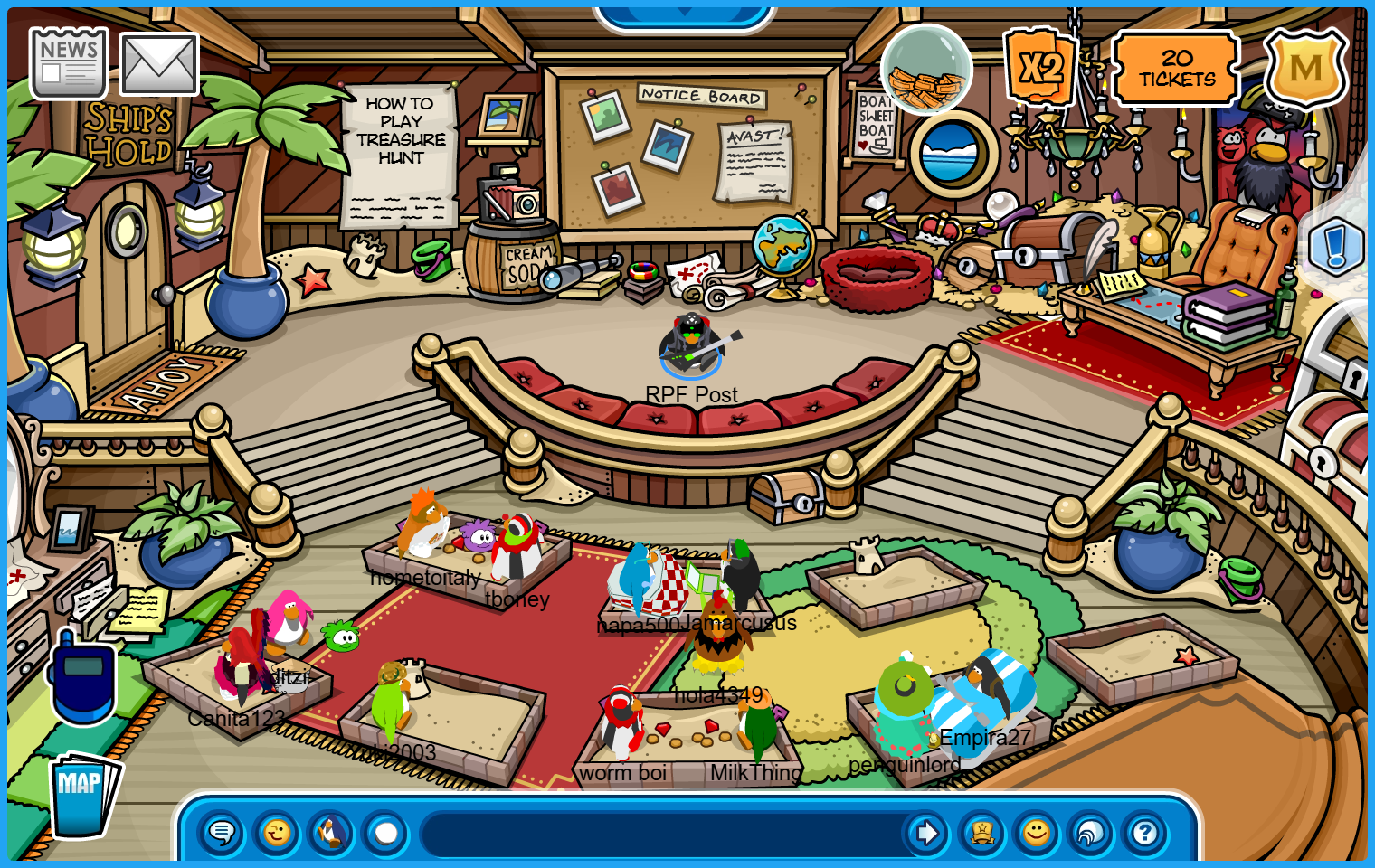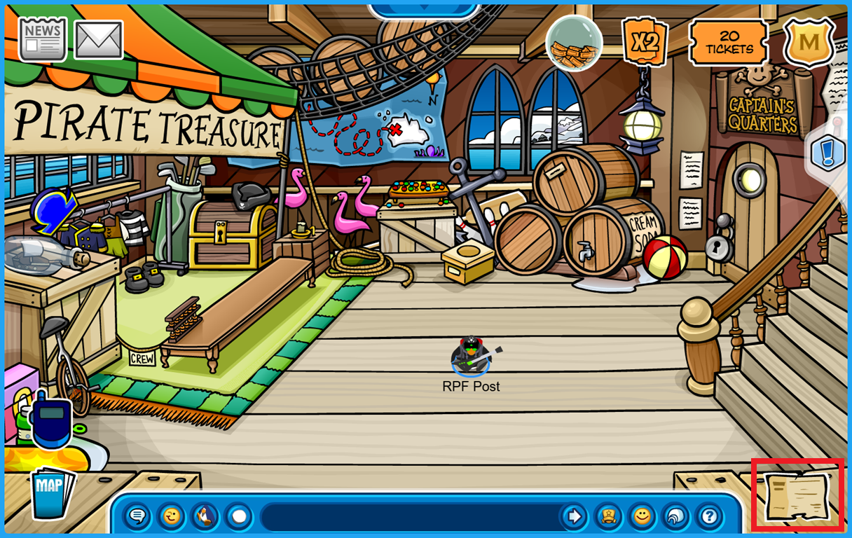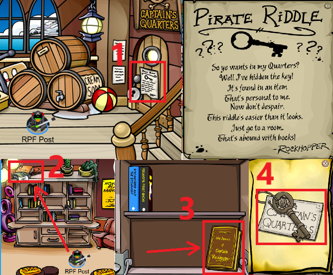 The Migrator has once again docked on the Beach, which also means the return of the revered Treasure Hunt game! But first, you will need to unlock the Captain’s Quarters. Go to the Bookroom and click on the orange book at the top of the bookcase. Then, click on Rockhopper’s journal and flip towards the end to get RH’s key to unlock the quarters!