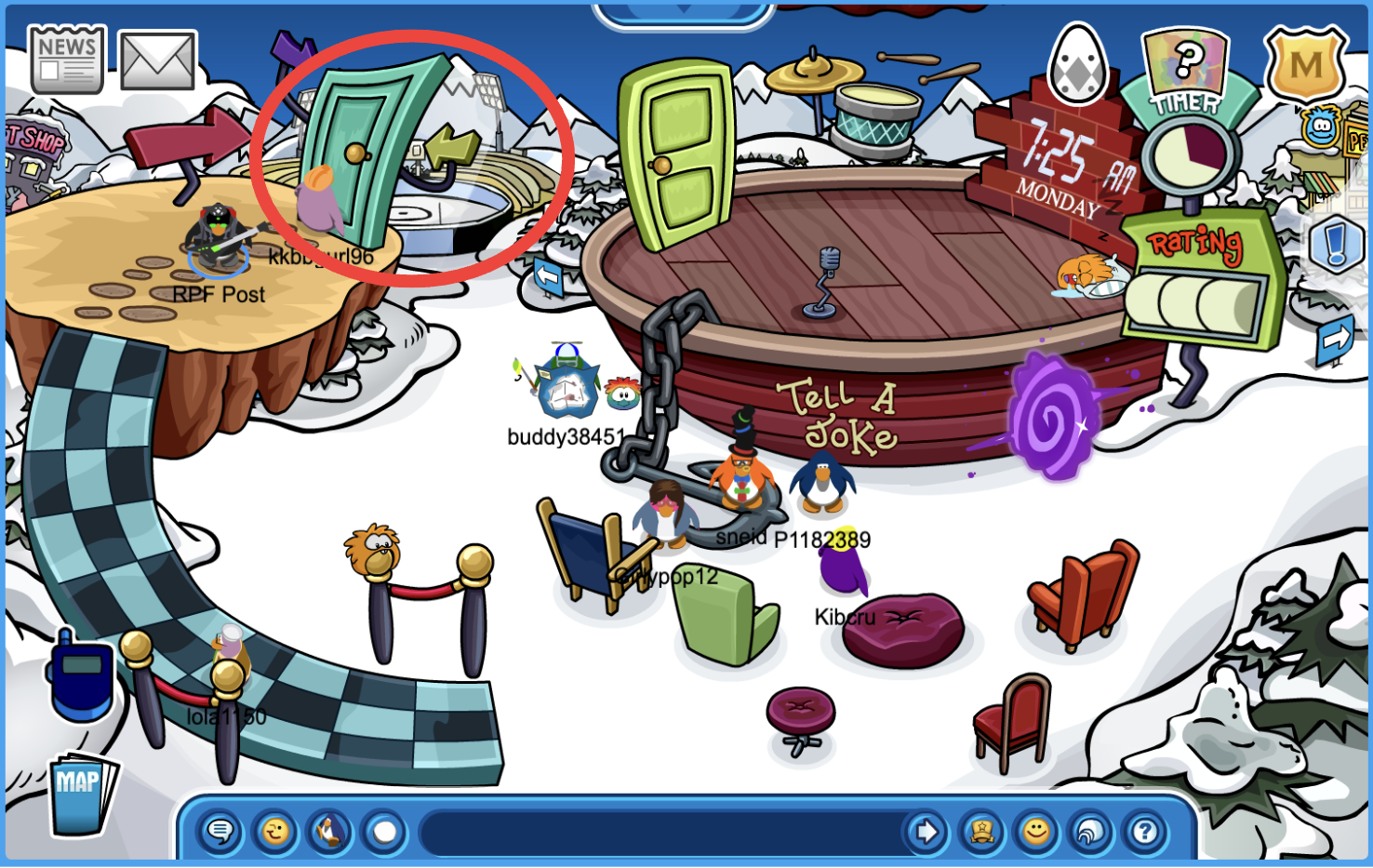 Head to the Snow Forts and wait by the door till it’s your turn to go on stage