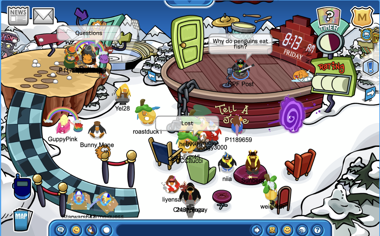 Head to the Snow Forts and tell 10 jokes on the stage this can be done by clicking “J”, (this quest takes a while to get so you might have to go on the stage again to get it).