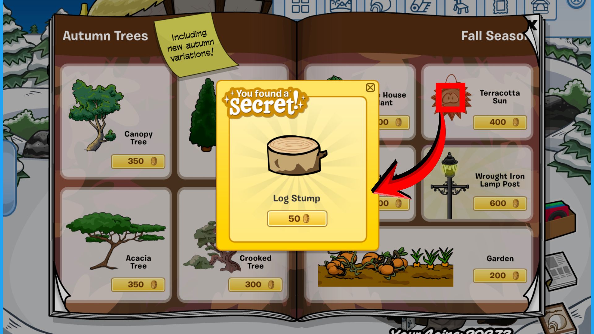 Click the small branch to find the potted tree which can be purchased for 250 coins