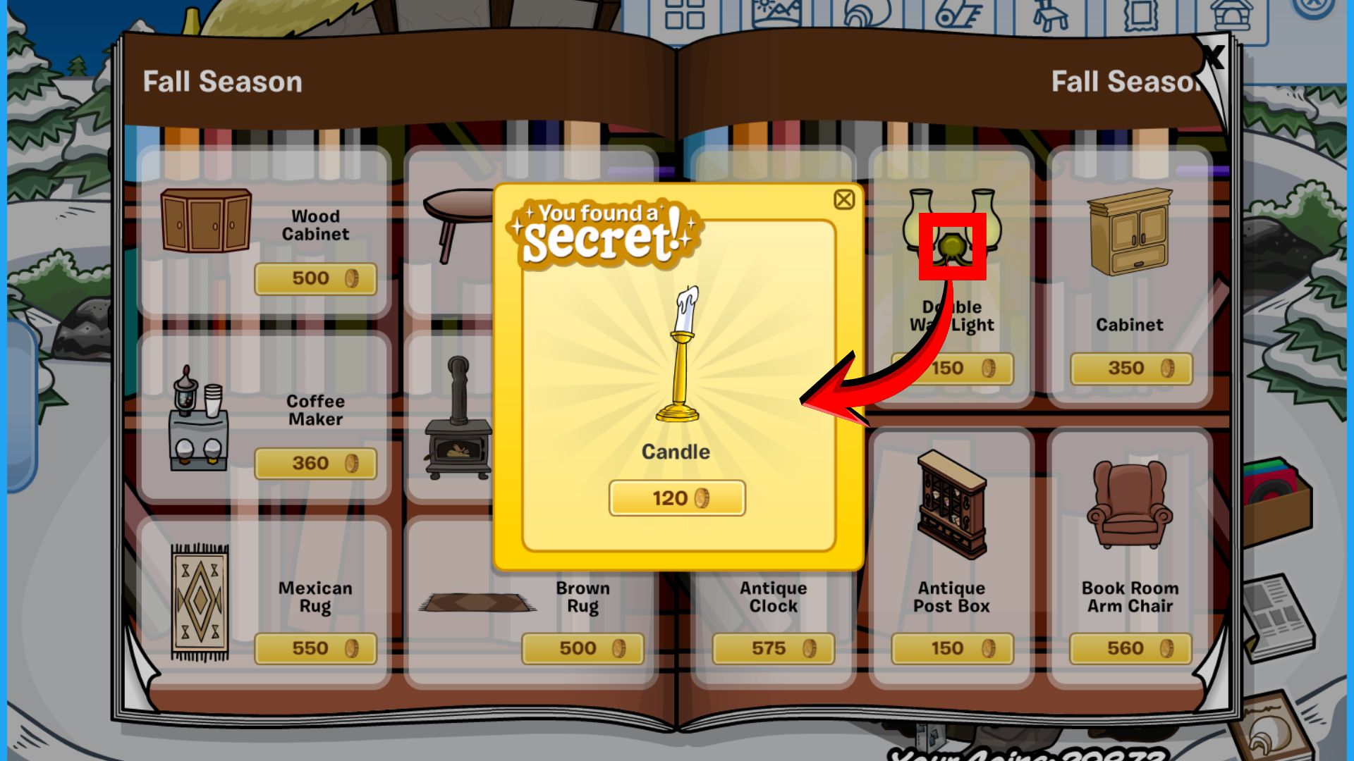 Click the center of the double wall light to purchase the candle for 120 coins