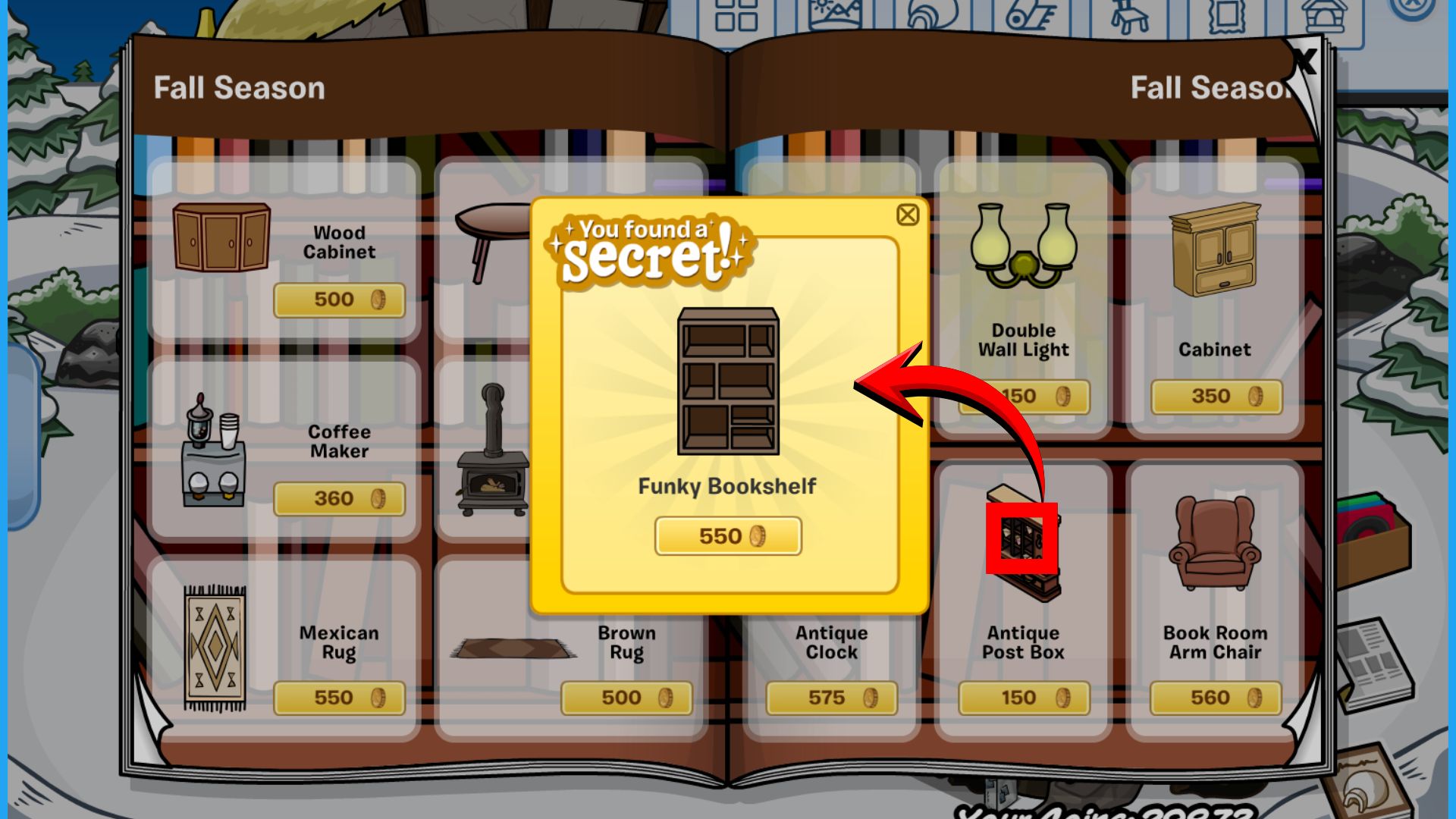The Funky Bookshelf can be found on the mail in the Antique Post Box and purchased for 550 coins