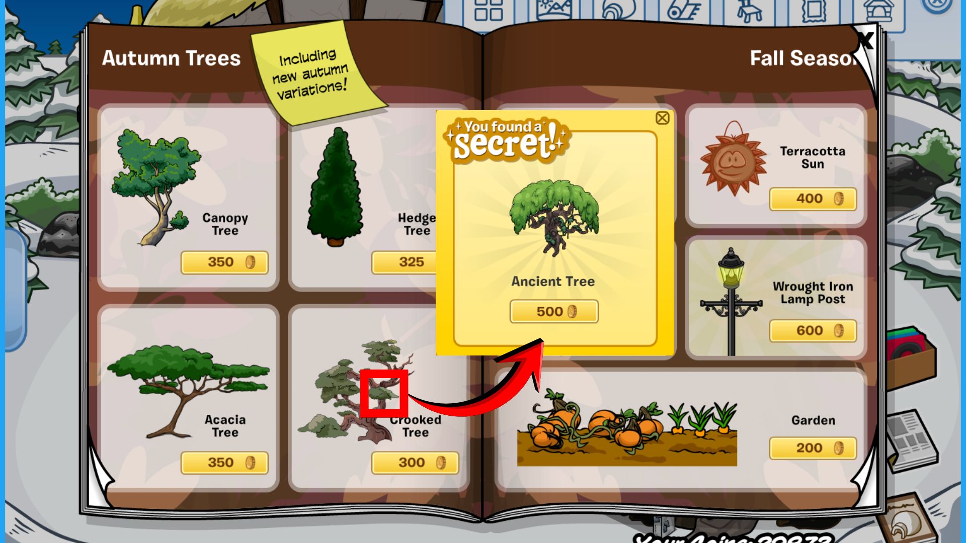 Click on these leaves to purchase the Ancient Tree for 500 coins