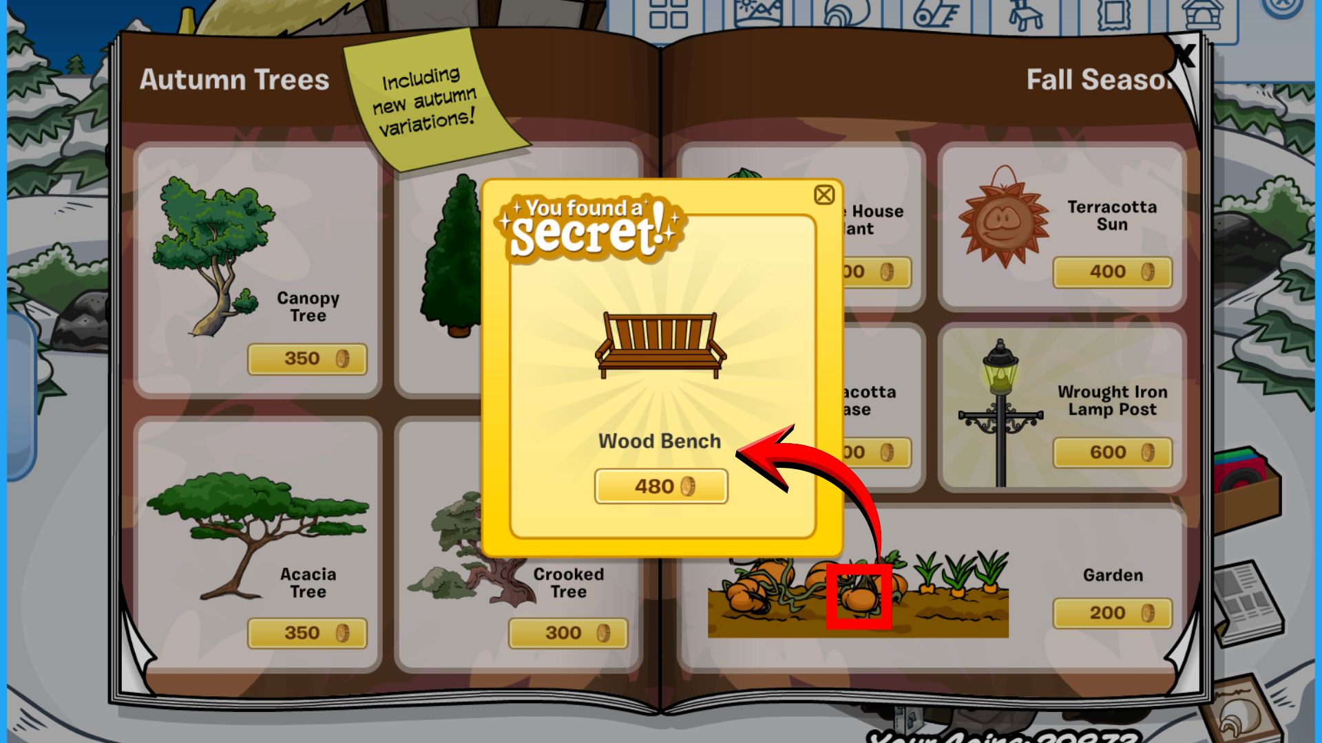 Click the pumpkin to purchase the Wood Bench for 480 coins