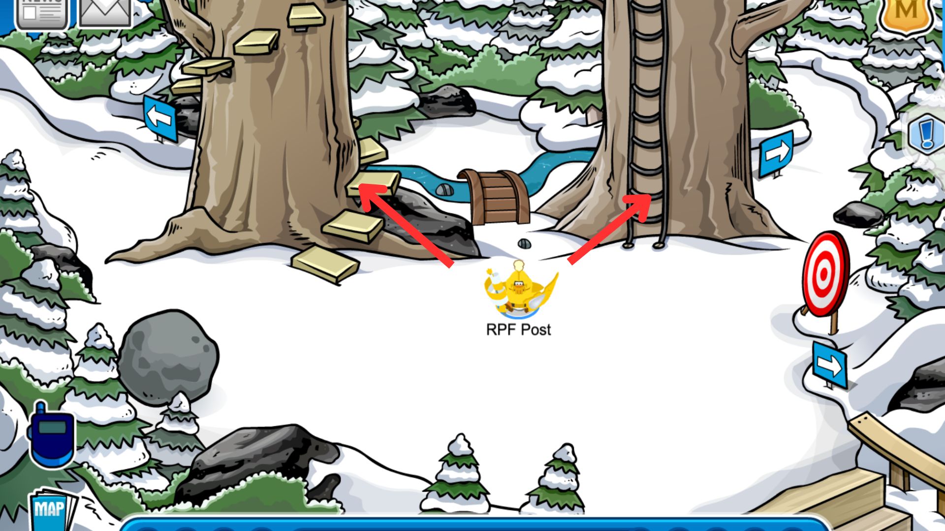 Next, head over to the Treeforts that can be found in the Forest and throw a snowballs to the target that is located next to the ladder and arrow sign!