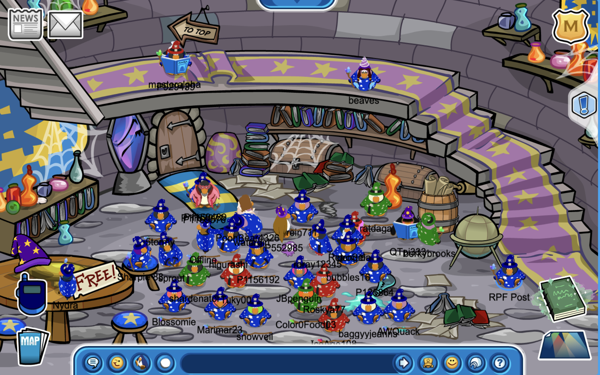 For this quest, head over the Lighthouse, grab a Wizard outfit from catalog in the lighthouse, and join up with 29 other penguins wearing the same thing!