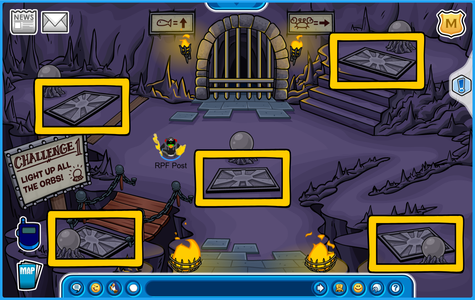 Room 2: The gate will open by hitting the targets 50 times with snowballs. Grab a free Iron Staff and Shield before you proceed to the next!