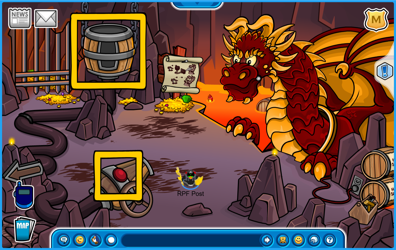 Room 4: Fill the barrel with snowballs and press the red button to attack the dragon until it malfunctions. The gate will open after.