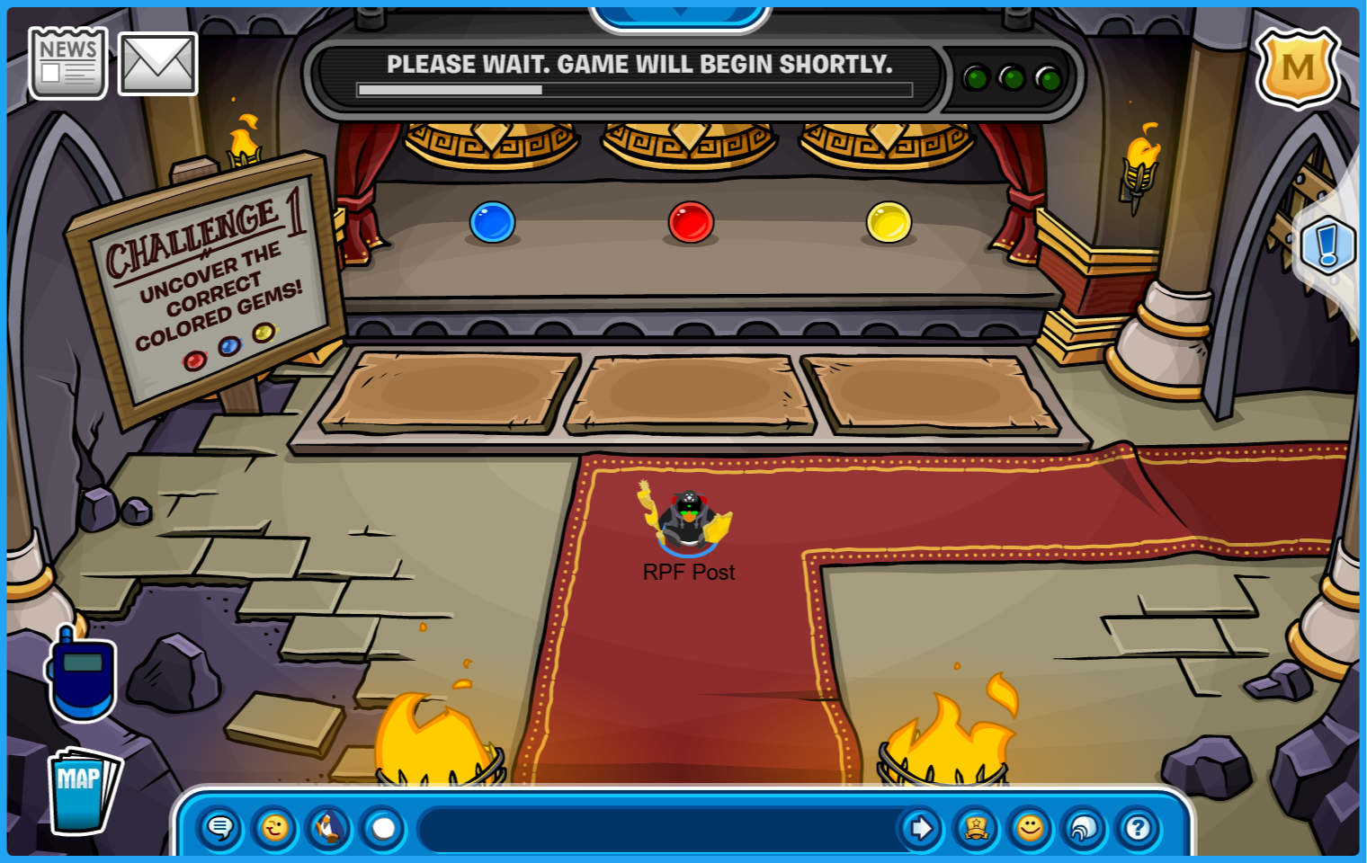 Room 1: Correctly uncover 3 colored gems by stepping on the corresponding platforms.