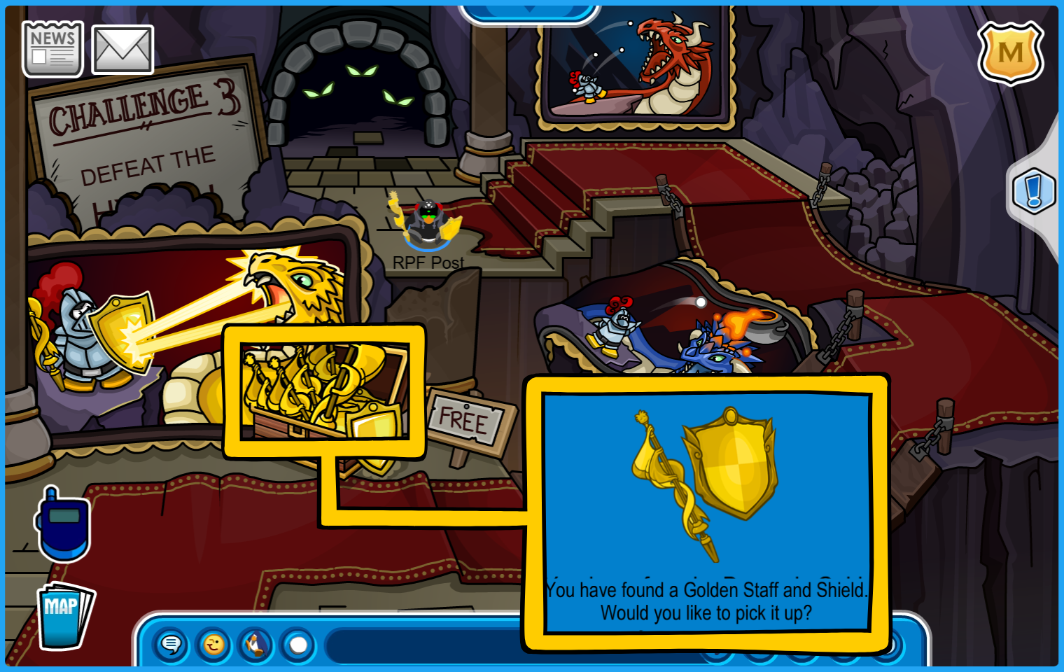 Room 3: Claim and equip your freeGolden Staff and Shield as it’s needed for the battle next room. The murals in this room are clues.