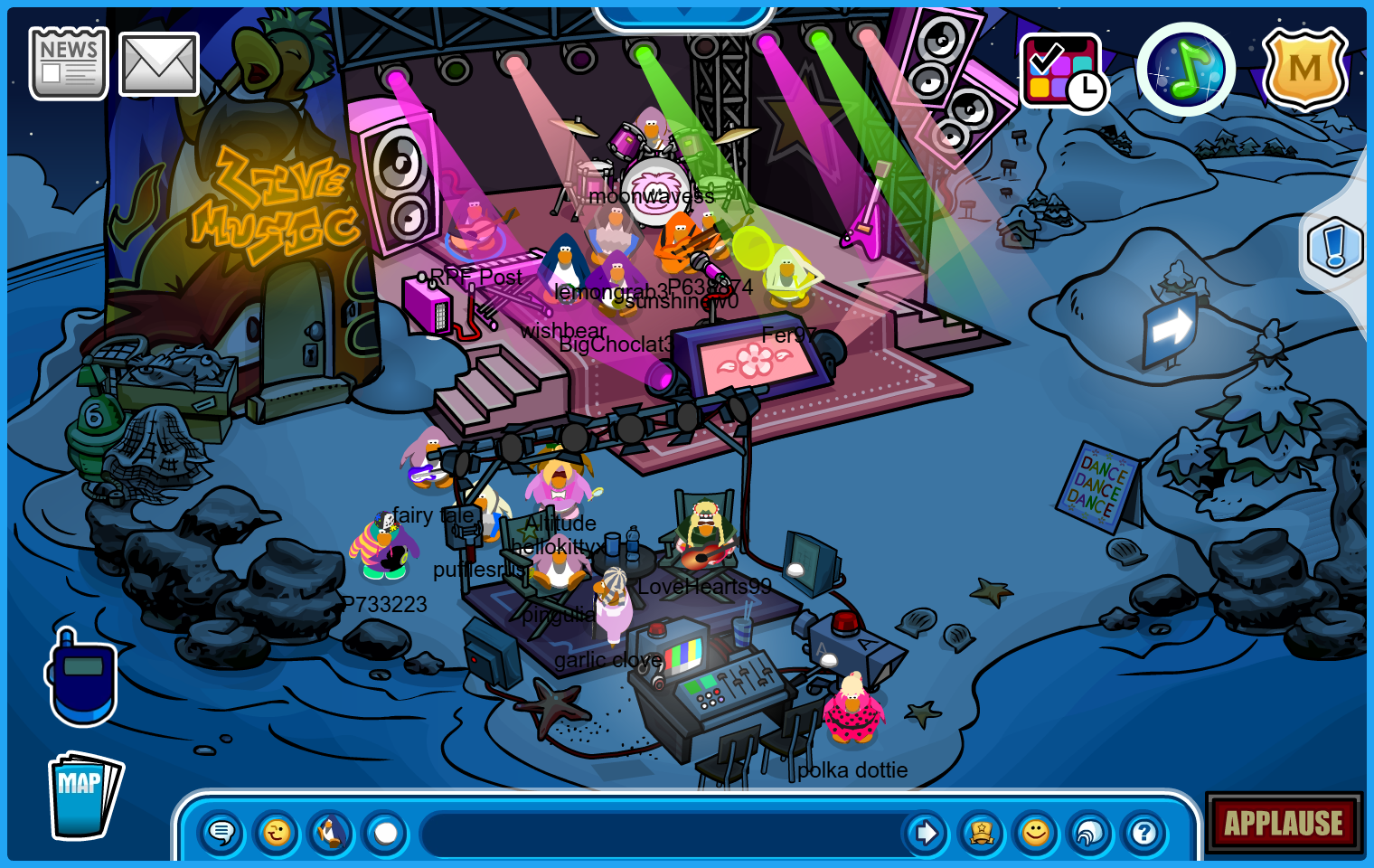 Take out the free Boombox you collected earlier, equip, and dance on one of the four colored lights! All four areas will need penguins dancing, and can only be done during the day.