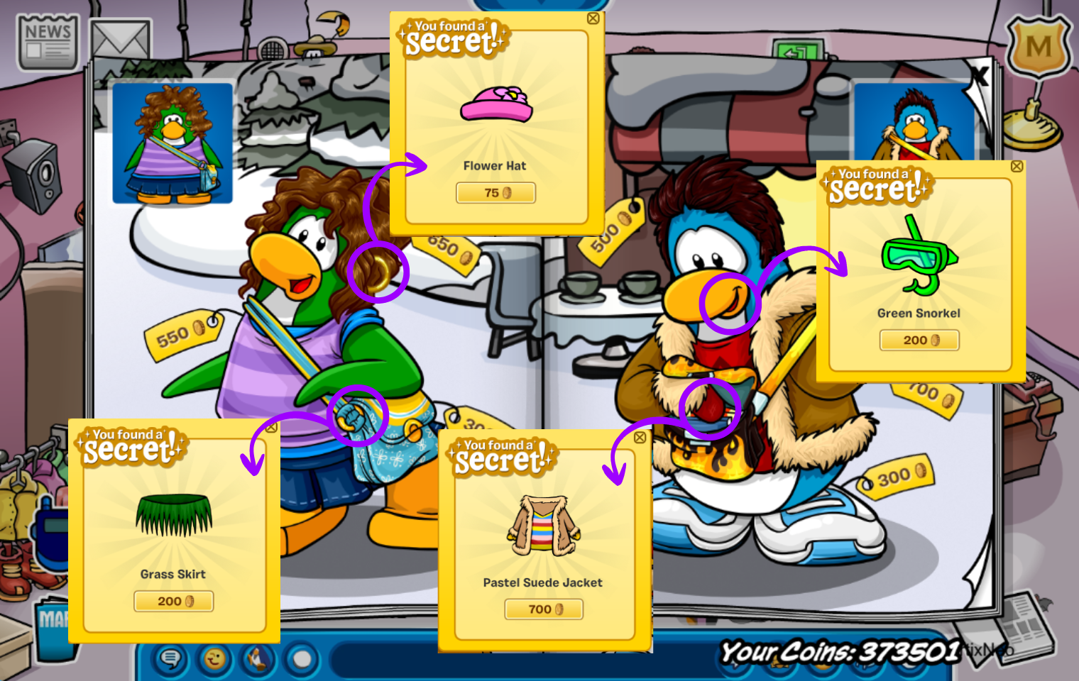Green Snorkel: Click on the right penguin’s mouth – 200 coins