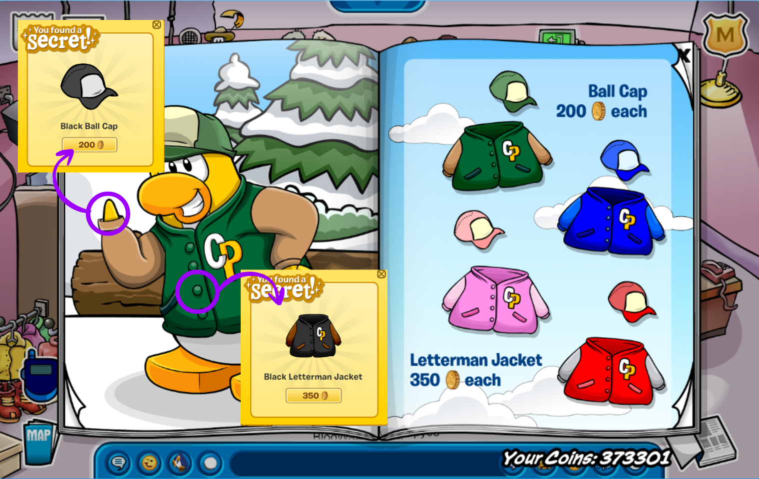 Black Letterman Jacket: Click on the third button of the penguin’s jacket – 350 coins