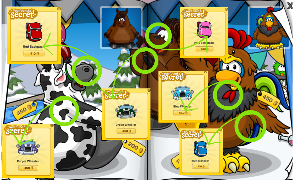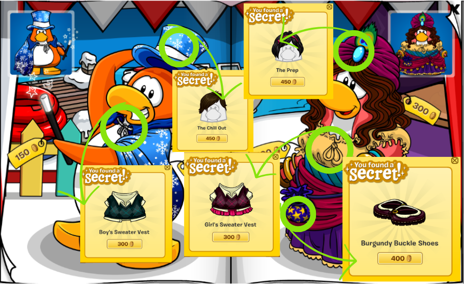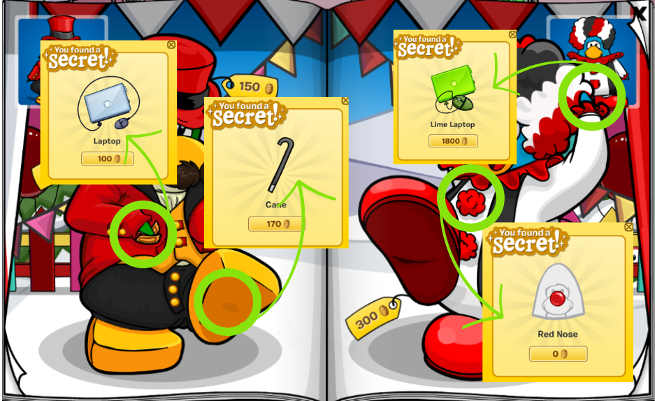 ❧ Click on the bottom of the green penguin’s foot for Cane. [170 coins]
