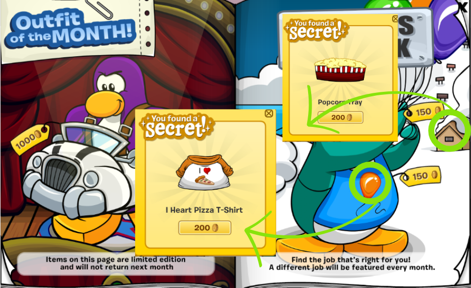 ❧ To find the first hidden item, click the balloons on the apron. The item is the I Heart Pizza T-Shirt [200 coins]