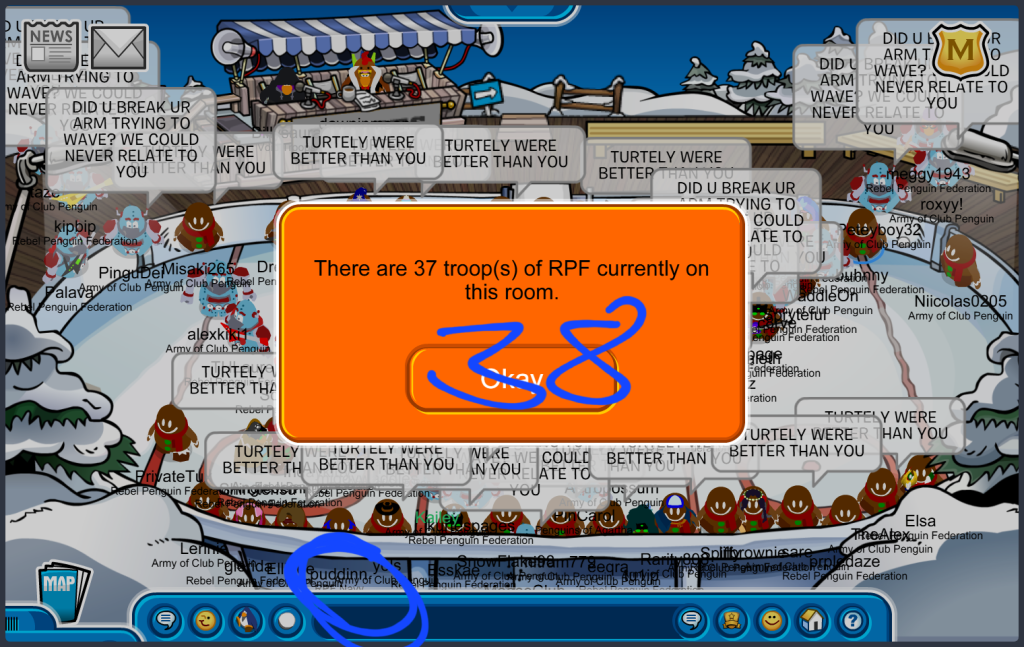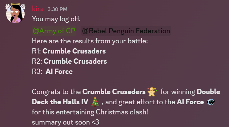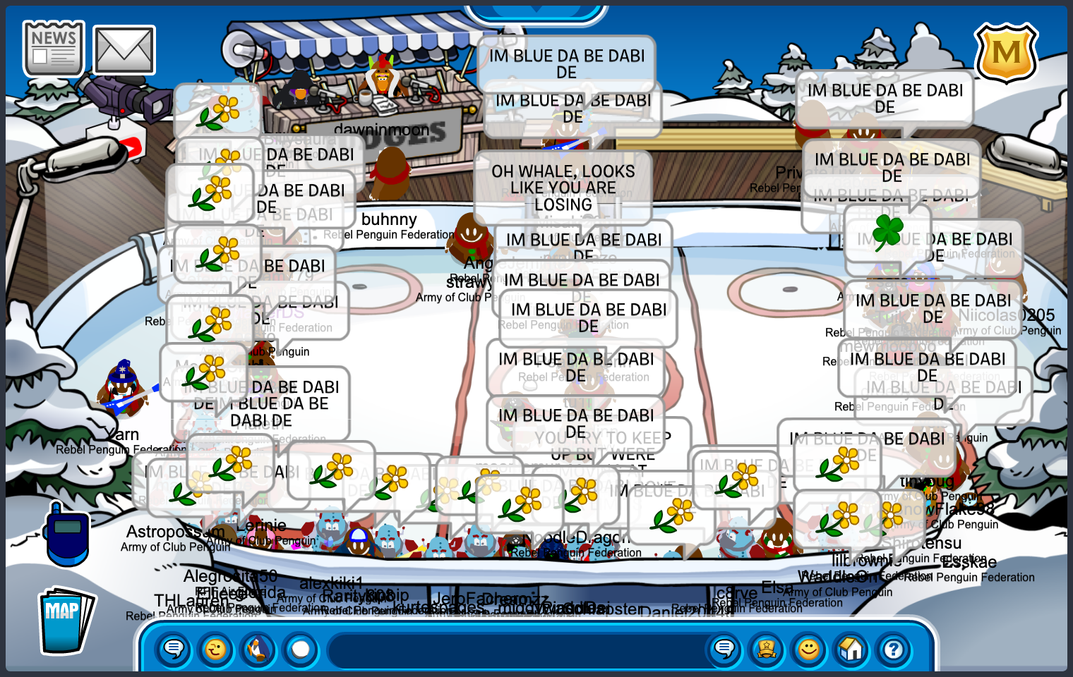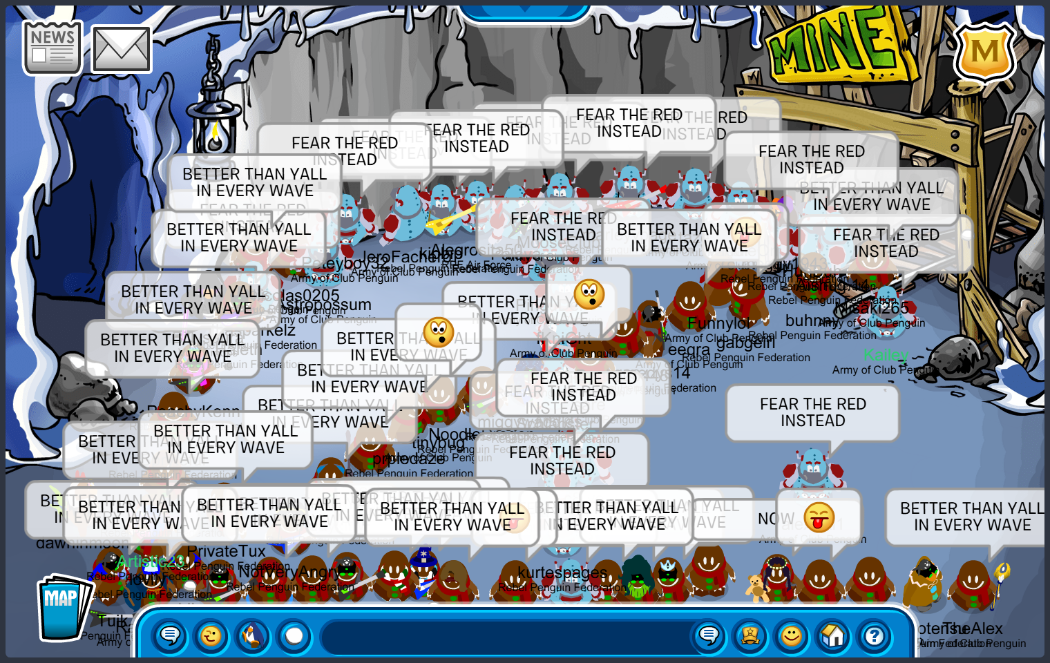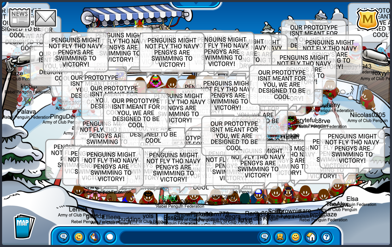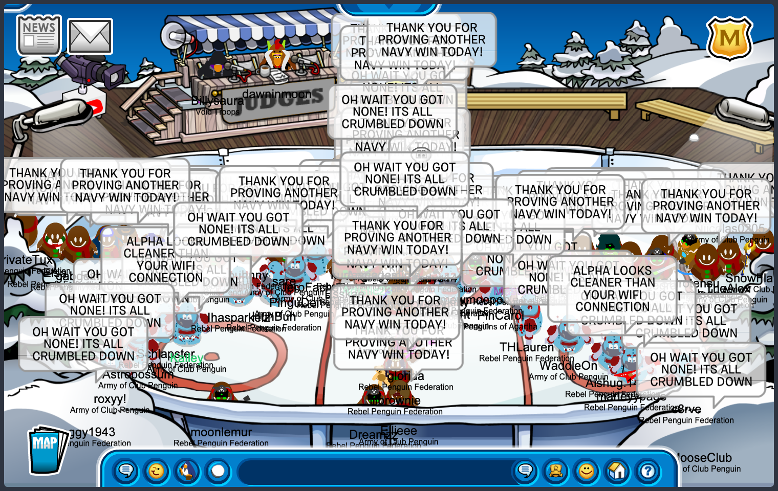 Season’s greetings, Rebels! Today we logged onto CPAB–Battleground for our epic Double Deck the Halls IV joint–branch battle with our allies, Army of Club Penguin! The Navy/Echo team fought as the Gingerbread fleet vs. the Air Force/Alpha team who battled as the Robots. We had a festive time battling, crumbs and circuits were flying! Both teams showed off their crisp formations and jolly good tactics, but only one team could prevail. Also huge thank you to ACP for joining us in this epic battle!