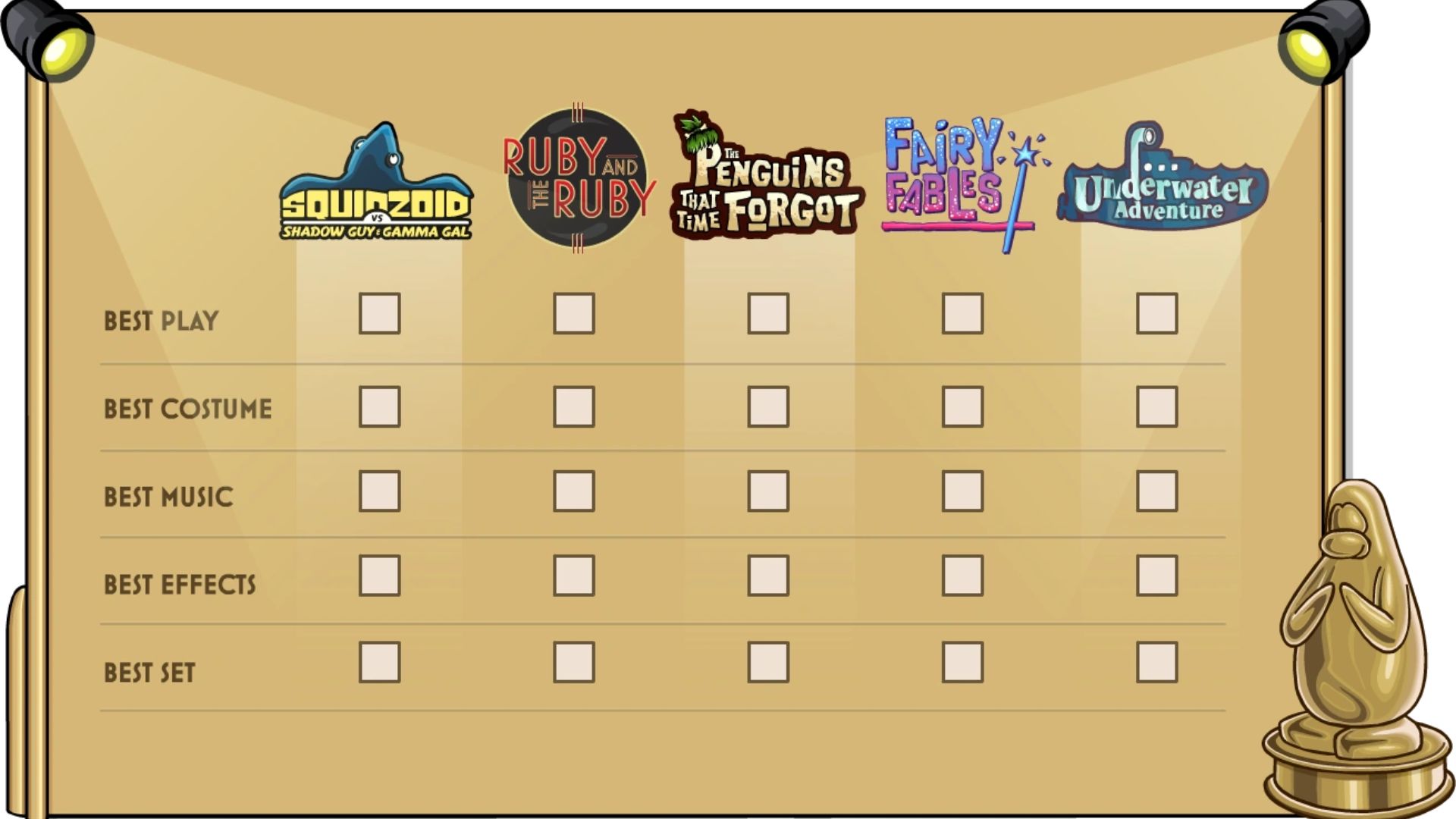 The fun keep going!, because you get to vote for different things like: Best Play, Best Costume, Best Music, Best Effects and Best Set for five different plays! The plays are: Fairy Fables,Underwater Adventure, Ruby and the Ruby, Squidzoid vs Shadow Guy & Gamma Gal and The Penguins That Time Forgot.