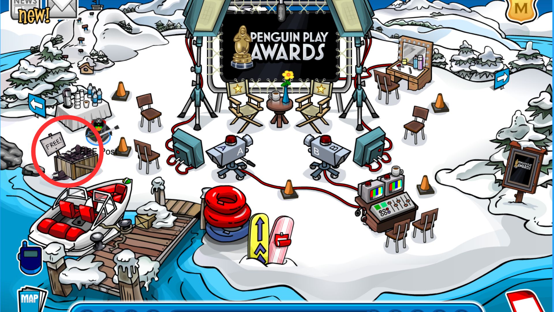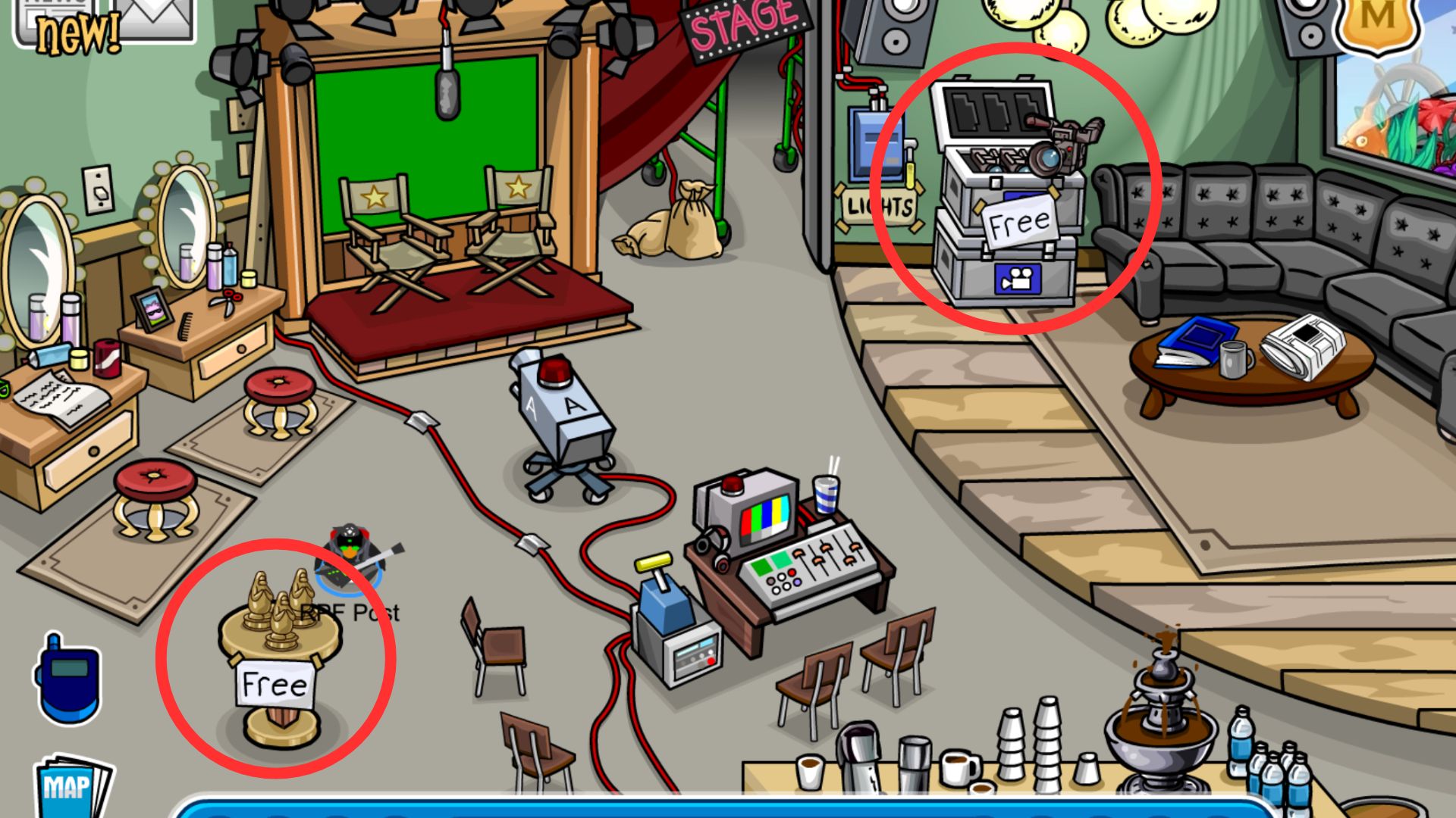 There are two free items in this room! The Penguin Play Award that’s located in the bottom left and the Video Camera that’s located in the middle right of the room!