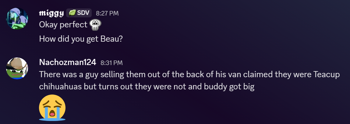 Nachoz: There was a guy selling them out of the back of his van claimed they were Teacup Chihuahuas but turns out they were not and buddy got big.