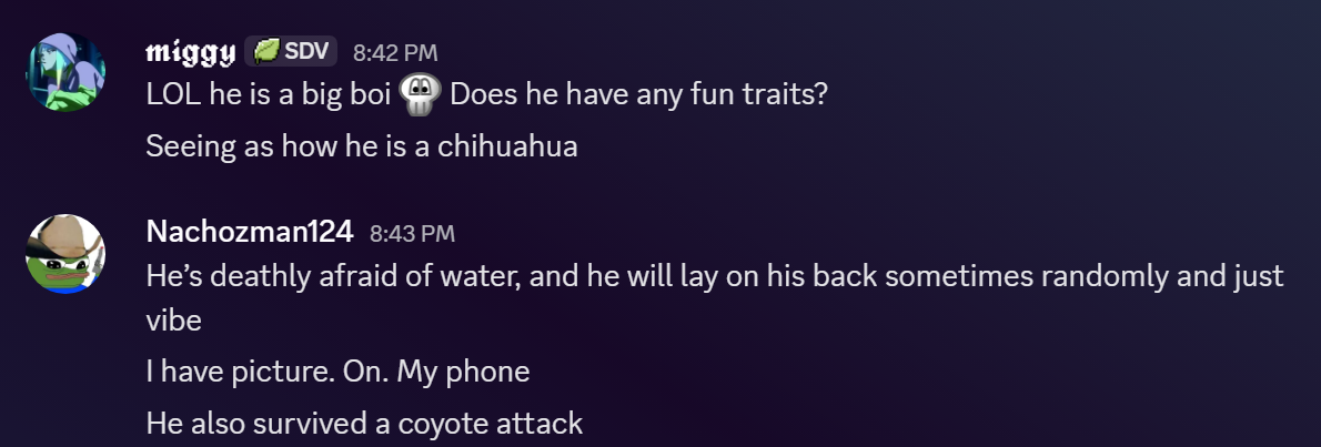 Nachoz: He’s deathly afraid of water, and he will lay on his back sometimes randomly and just vibe, I have a picture on my phone.